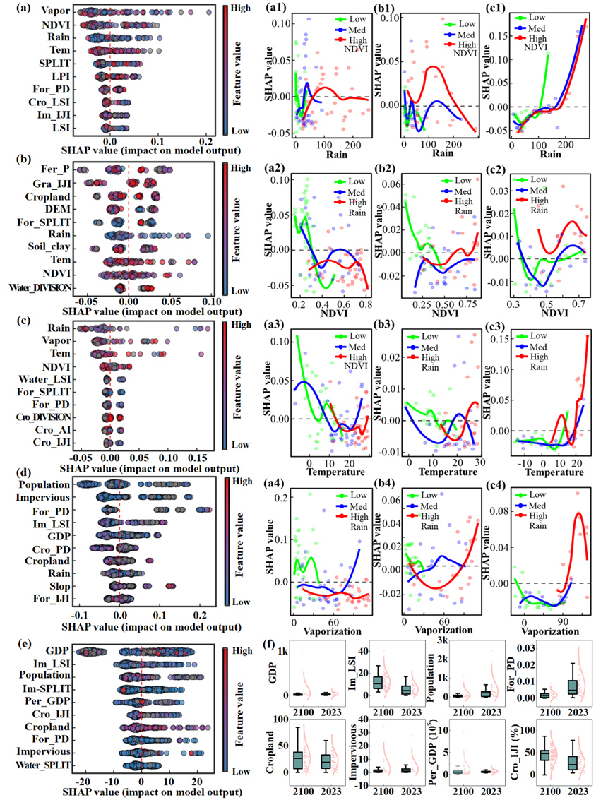 为揭示营养盐污染及其演变格局,研究使用SHAP方法解析模型,发现景观配置(如森林斑块密度、耕地连通性、不透水面复杂度)是主导因子,其贡献度高达64.5%,而气候因子的贡献仅为7.2%至35.5%。未来气候模型的不确定性对预测结果的影响极小。进一步分析还识别出多个关键驱动因子的“临界转变阈值”,即当某一因子超过特定数值时,其对污染的影响方向或强度会发生突变。在冷点区,耕地面积扩张、不透水面复杂度上升以及GDP增长等因子,预计将在2100年前后超过其历史临界阈值,从而在模型中引发营养盐污染指数的非线性暴增,最高增幅可达218.1%。这一发现表明,未来的污染演变并非过去趋势的线性外推,而是可能由突破多个阈值所触发的系统性重组。