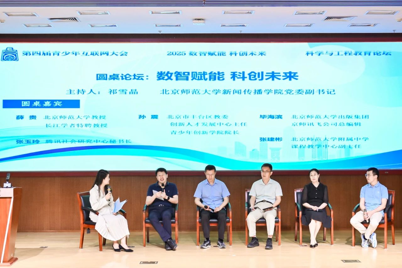 “数智赋能 科创未来”圆桌论坛环节,由北京师范大学新闻传播学院党委副书记祁雪晶主持,北京师范大学认知神经科学与学习国家重点实验室教授薛贵、北京市丰台区教委创新人才发展中心主任孙震、腾讯社会研究中心秘书长张玉玲等多位专家围绕青少年数字素养提升路径、科技教育体系构建与家庭协同机制展开深入探讨。薛贵指出,数智赋能脑科学研究,助力拔尖创新人才必须聚焦人脑,聚焦青少年客观发育规律,聚焦个性化精准赋能。张玉玲结合腾讯调研数据提出,家庭在青少年网络使用行为中的影响日益凸显,建议构建“学校—家庭—平台”三位一体的教育协同机制,推动形成支持性更强的家庭数字成长环境。与会嘉宾普遍认为,数字素养教育应强调价值判断、责任意识与创造能力的培养,需在政策、课程与社会支持层面实现多元协同与系统化升级。