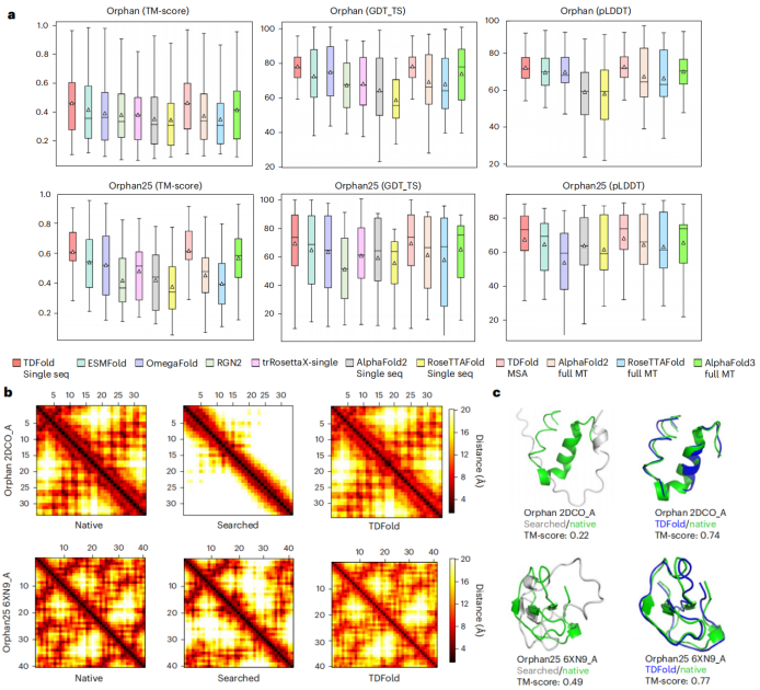 图2:TDFold在孤儿蛋白的二维几何模板生成和三维结构预测性能达到最优水平