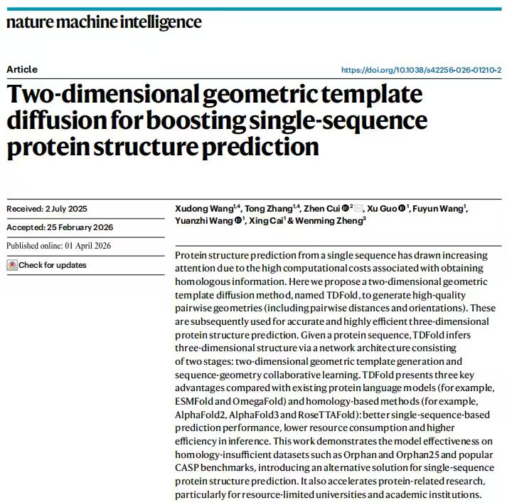 近日,人工智能学院崔振教授团队在《自然-机器智能》(Nature Machine Intelligence)上在线发表研究论文“Two-Dimensional Geometric Template Diffusion for Boosting Single-Sequence Protein Structure Prediction”。论文首次将三维蛋白质结构预测问题建模为二维视觉扩散学习任务,提出二维几何模板扩散框架TDFold,构建“二维图像到三维结构”重建的新范式,形成“蛋白质几何空间—视觉图像编码、二维拓扑几何—视觉扩散生成、三维结构—图网络解码”的系统化技术路径,实现了预测性能更优、资源消耗更低、推理效率更高的目标,为三维构象解析提供了全新解决方案。