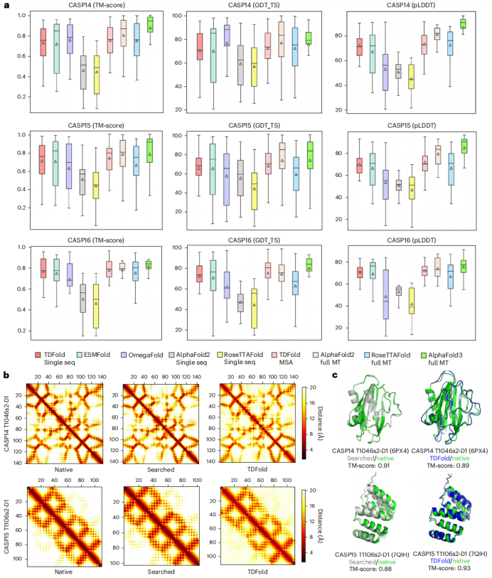 图3:TDFold在通用蛋白的二维几何模板生成和三维结构的单序列预测性能达到最优水平