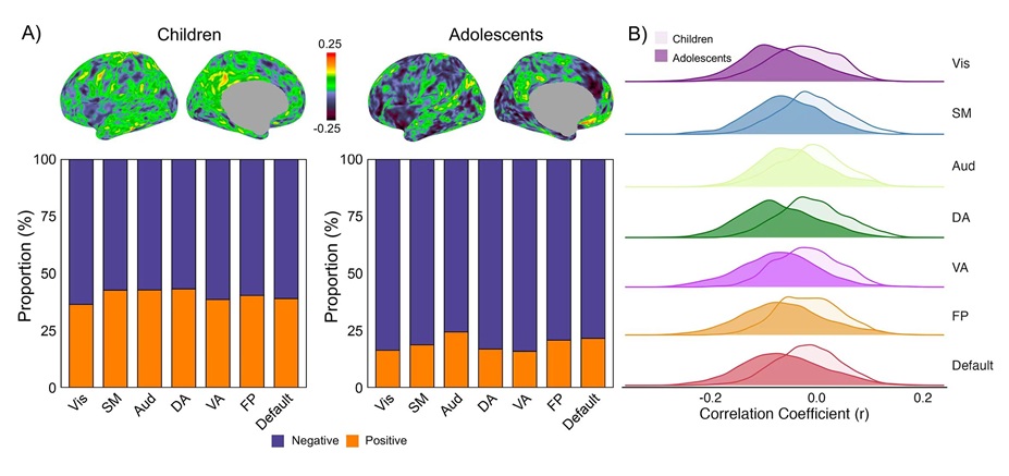 图2 儿童与青少年的皮层同伦功能亲和度与总智商的关联。A) 不同年龄组同伦功能亲和度与总智商的相关及每个网络内相关系数的正负比例;B) 两组相关系数在不同网络上的分布。
