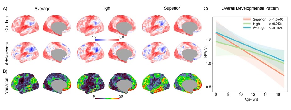 同时,皮层同伦功能亲和度与智力之间呈现出与发展阶段依赖的关系:进入青春期后,与总智商间的负相关更为突出,主要见于前额叶、岛叶及内侧默认网络等区域(图2)。进一步按总智商将个体分为平均智商、高智商与超高智商三组后,研究发现超高智商个体在全脑范围内呈现更快且更广泛的皮层同伦功能下降趋势,并在多个网络上表现出更强的发育变异性(图3),这从功能上指向了半球专业化发育进程的加速与更高的神经功能效率。