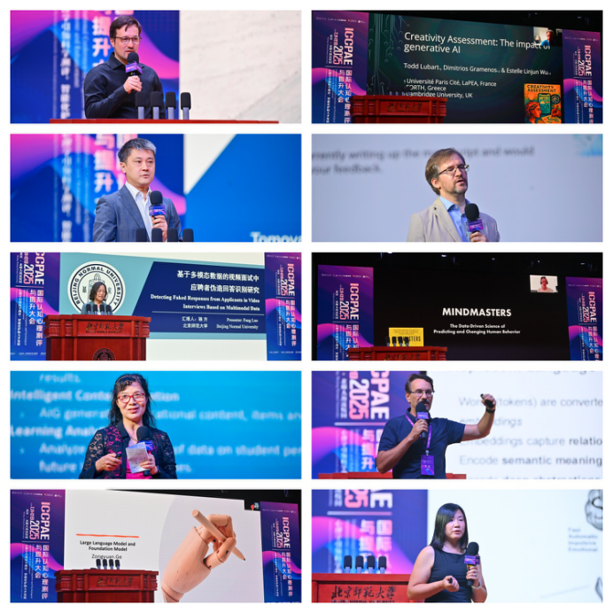 7月11日的主论坛由10位专家带来有关人工智能技术与心理测量、教育测量的深度融合的精彩报告。瑞士圣加仑大学教授Clemens Stachl讲述了如何在智能手机安装APP记录用户日常使用数据并对个体人格进行精准评估。法国巴黎西岱大学教授Todd Lubart是创造力测评的国际著名专家,重点报告了生成式人工智能如何在创造力测评中发挥作用。来自经合组织(OECD)的教授Tomoya Okubo报告了如何在国际大型评估中使用生成式人工智能命题与自动化评分的新尝试。剑桥大学教授David Stillwell的报告,采用多模态大模型为不同性格的用户生成广告图片,为商家开展精准营销提供了全新的思路。北师大教授骆方对多模态数据进行建模,实现了对视频面试中的应聘者伪造的精准识别。哥伦比亚大学教授Sandra Matz探讨了预测和改变人类行为的数据驱动科学。来自美国教育考试服务中心(ETS)的颜端丽分享了如何自动识别学生是否在写作中使用了生成式AI。来自巴西圣弗朗西斯科大学的教授Ricardo Prim基于BERT的自动化大五人格评估为人格测评提供了新技术角度。加拿大阿尔伯塔大学的教授崔迎基于用户与AI的聊天对话框中文本数据对批判性思维进行了评估,为AI辅助教育诊断开辟新径。