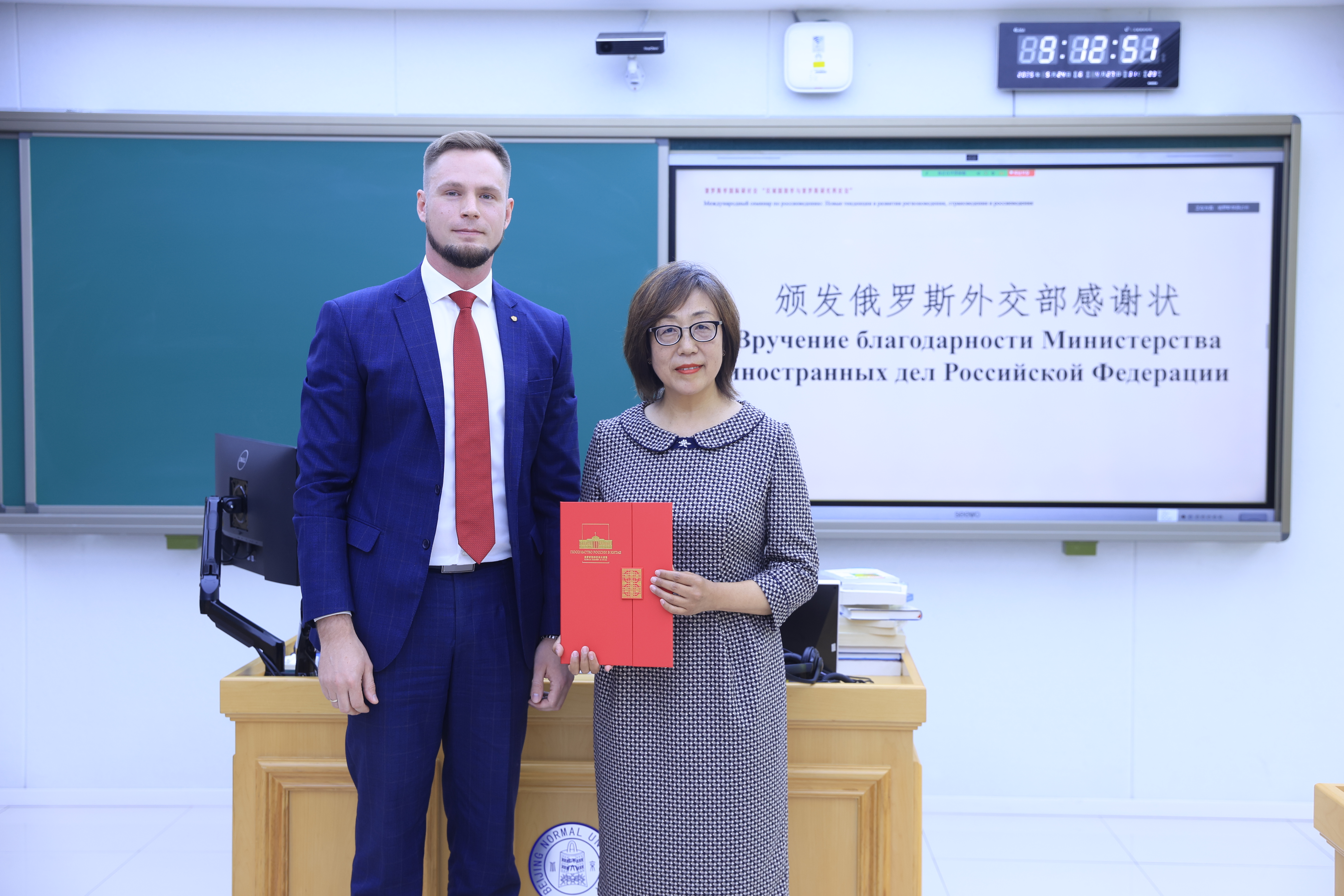 北京师范大学副校长陈兴作开幕式致辞。陈兴在致辞中强调,北京师范大学在俄罗斯研究领域具有深厚积淀和跨学科优势,当前世界格局变化为区域国别研究带来新挑战与机遇,期待本次会议能够助力学科范式创新,为中俄人文交流与学术合作贡献智慧。开幕式上,俄罗斯联邦驻华大使馆一等秘书阿列克谢·谢尔盖耶维奇·科斯马切夫为北京师范大学外国语言文学学院教授、俄罗斯研究中心主任刘娟颁发俄罗斯外交部感谢状,以表彰刘娟在中俄人文交流与学术研究领域的卓越贡献。