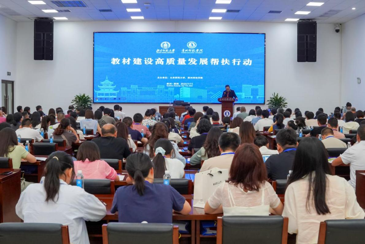 为深入贯彻党的二十大精神,积极响应《教育强国建设规划纲要(2024—2035年)》中“打造培根铸魂、启智增慧的高质量教材”要求,加速教材建设服务教育强国进程,推进“北京师范大学、人民教育出版社、贵州师范大学、贵州师范学院四方合作框架协议”落地实施,助力贵州省教材建设高质量发展,7月11日至12日,北京师范大学携手贵州师范学院共同举办教材建设高质量发展帮扶交流会。此次活动汇聚了教育行政部门有关同志、国内外知名教育专家、教材编写与出版专业人士,以及帮扶县教师代表、省级教材建设研究基地代表、大中小学教师及教研员代表、贵州师范学院师生代表等230余人。