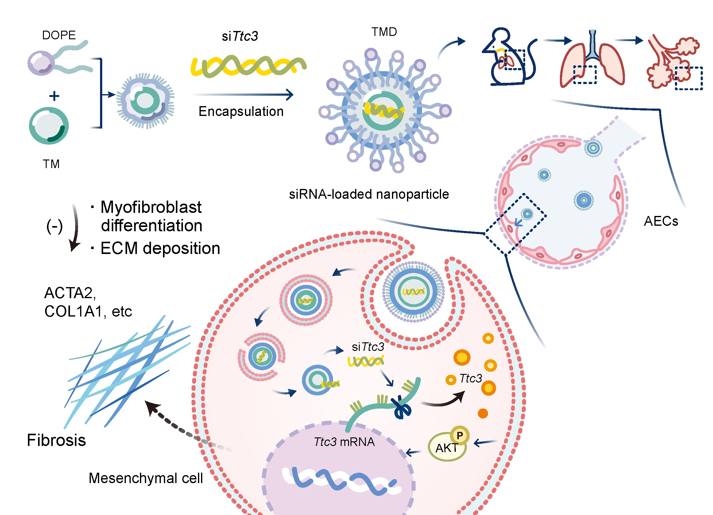 在此基础上,研究团队设计并构建了一种新型脂质纳米颗粒载体(TMD),用于高效递送靶向Ttc3的小干扰RNA(siRNA),能够实现siRNA的高效包载与稳定递送,并在肺组织中表现出良好的递送效率和安全性。在博来霉素诱导的小鼠肺纤维化模型中,siTtc3@TMD治疗能够有效降低肺组织中Ttc3的表达水平,显著抑制PI3K/Akt信号通路的异常激活,减轻肺组织纤维化损伤并改善肺功能,进一步验证了Ttc3作为IPF潜在治疗靶点的可行性和应用价值。