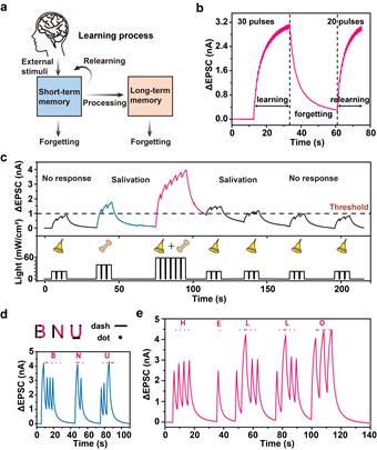 在国家自然科学基金委、北京师范大学和中国科学院的大力支持下,化学学院脑化学研究实验室毛兰群和蒋亚楠课题组致力于活体脑化学的检测、调控和模拟研究。在前期的研究中,通过合作,他们发展了一种聚电解质限域的流体忆阻器,利用单个器件首次实现了神经化学信号与电信号转导的模拟(Science 2023, 379, 156-161);通过构建光响应的卟啉基金属有机框架膜(MOFM),发展了一种仿生光响应离子通道与光驱动离子泵(Angew. Chem. Int. Ed. 2020, 59, 12795-12799;Angew. Chem. Int. Ed. 2023, 62, e202302997),实现了不同光响应机理的仿生离子门控开关和离子主动运输功能的应用。近期,该课题组报道了一种光调控纳米流体离子晶体管,通过不同的光脉冲调控MOFM中的离子传输,实现了突触权重的动态调节。进一步研究发现该器件在光脉冲刺激下可以模拟类兴奋性突触后电流和短期可塑性以及从短期可塑性到长期可塑性的转变过程。此外,通过光调控突触权重,该器件不仅能模拟人类大脑的经验学习行为和巴普洛夫经典条件反射的联想学习过程,还可以通过模式化光脉冲信号实现国际摩尔斯电码(如“BNU”、“HELP”、“HELLO”等)的编码,表明该器件在光学无线通信方面具备潜在的应用价值。