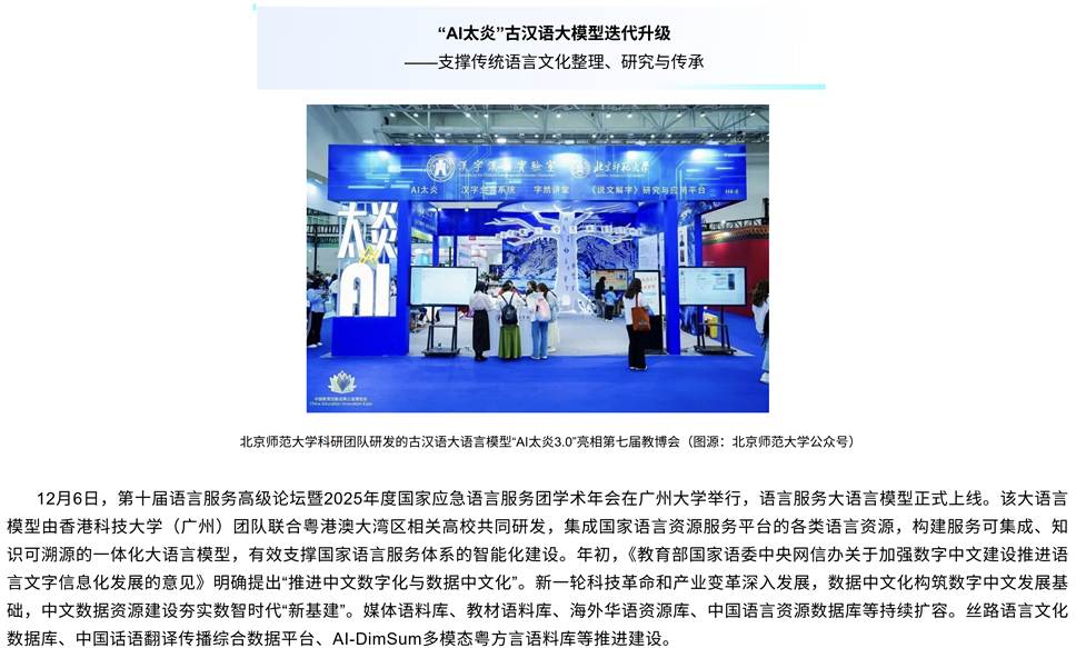 近日,教育部国家语言资源监测与研究中心推出2025年度中国语言文字信息化和数字中文建设十大新闻,北京师范大学汉字汉语研究与社会应用实验室团队研发的“AI太炎”古汉语大模型迭代升级入选。