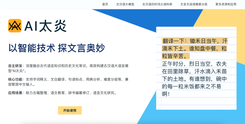 “AI太炎”是北京师范大学科研团队全流程自主研发的古汉语大语言模型,以1.8B参数规模有效应对古汉语信息处理的“低资源、富知识”挑战。该模型具有较强的古典文献释读能力,支持字词释义、文白翻译、句读标点、用典分析等多种具有挑战性的文言文理解任务。为致敬近代国学大师章太炎先生,秉承章黄学派弘扬中华优秀传统文化的宗旨,该模型命名为“AI太炎”。
