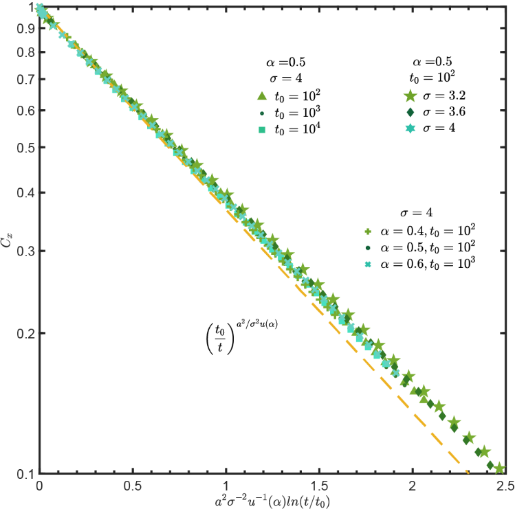 图3 | 研究在谐振势中(σ2=[(mω2)/(kВT)]),粒子在一维晶格(晶格间距 a=1)中对数老化随机扩散的自相关函数特征。