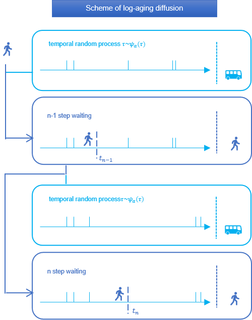 图1 | 我们通过一个乘客等公交的场景来展示对数老化扩散过程。每个公交站的发车间隔时间遵循长尾分布。当乘客到达第n-1站时,他们经历了tn-1的等待时间。一旦公交车抵达第n-1站,乘客迅速上车并前往下一站n,其行程时间远小于等待时间。到达第n站后,乘客开始等待下一班车,并记录等待时间为tn。