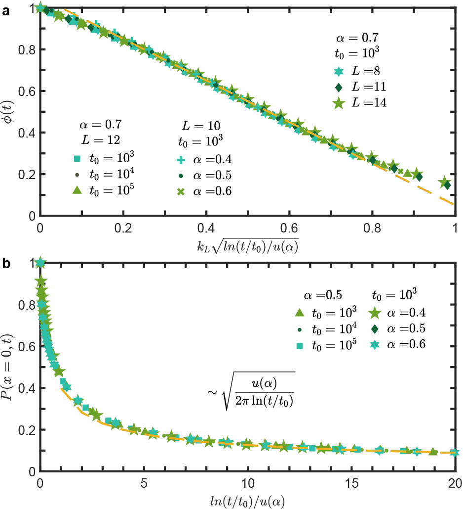 图2 | (a) 在一维晶格(长度 L,晶格间距 a=1)上,单个粒子在初始时间t0开始进行对数老化扩散的模拟存活概率 ϕ。(b) 模拟初始时刻t0位于原点的粒子返回原点的概率 P(x=0,t),以揭示其随时间返回初始位置的可能性。