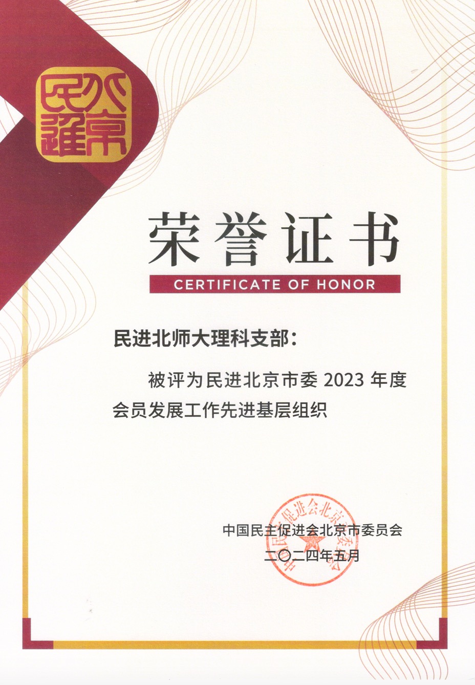 民进北京师范大学基层委员会获得“民进北京市委‘基层组织建设工作三年行动计划’先进基层组织”荣誉称号;民进北京师范大学基层委员会的“建‘工作母机’助教育高质量发展”活动项目获“民进北京市委‘基层组织建设工作三年行动计划’特色品牌工作”荣誉称号。