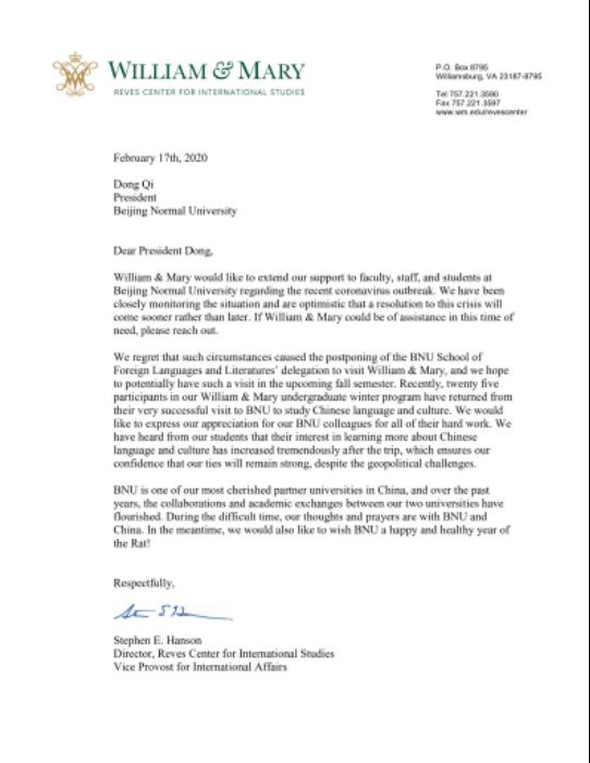 2月17日,北师大孔子学院合作伙伴、美国威廉玛丽大学副教务长Stephen Hanson致信我校,送来祝福与慰问,并高度评价双方在孔子学院等项目上的交流与合作。