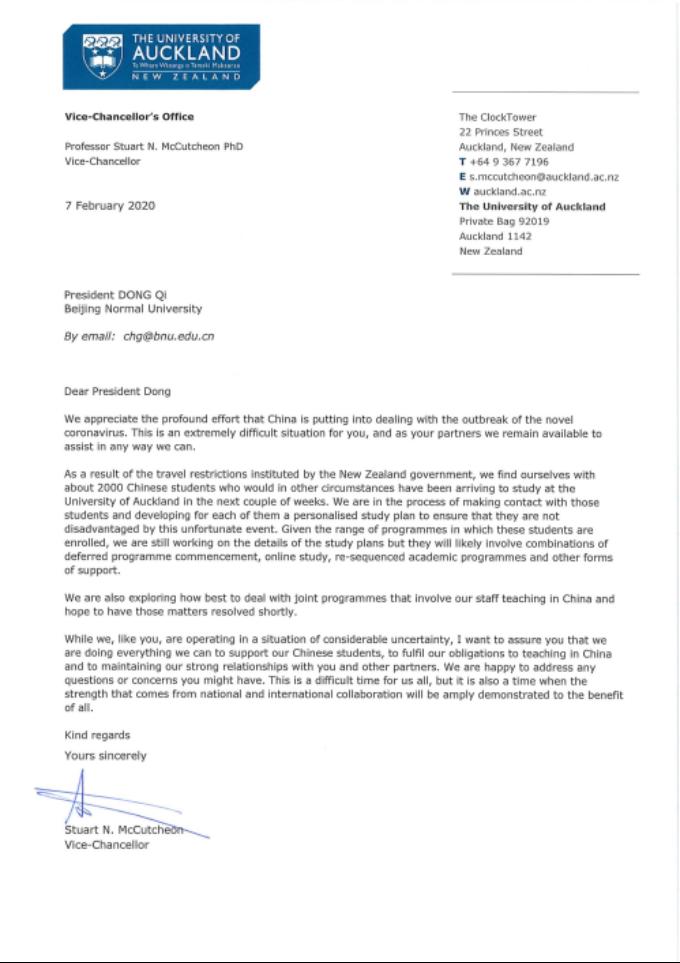 在南半球,奥克兰大学一直是我校派遣孔院志愿者教师最多的高校之一。2月7日,奥克兰大学校长Stuart McCutheon就至信我校表示慰问,希望共同为双方的交流项目提供必要的调整,尽量减少疫情的影响。