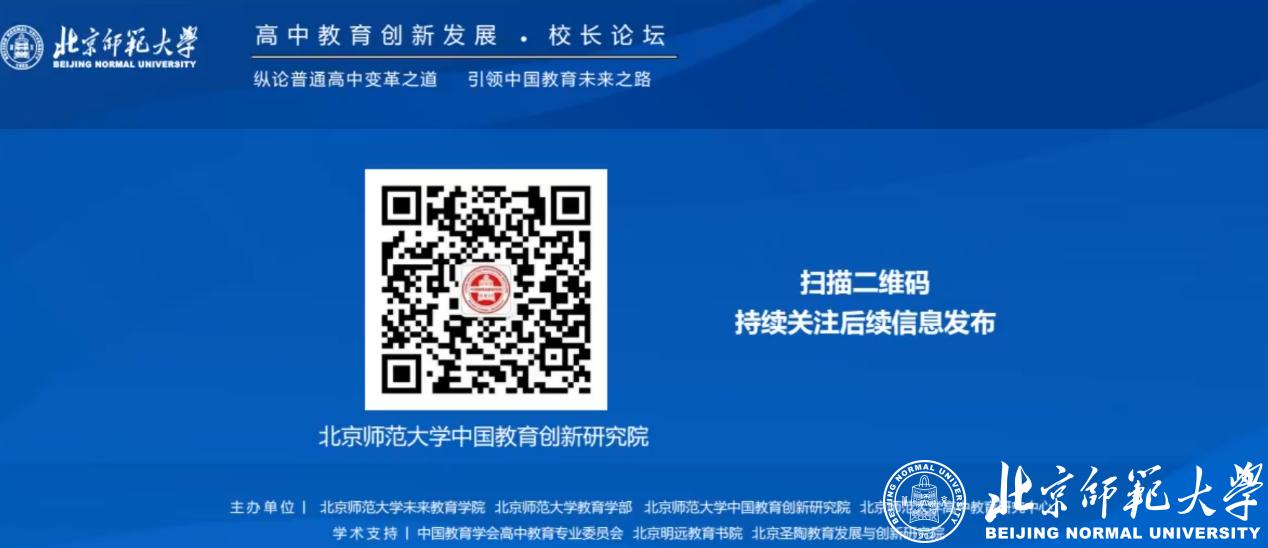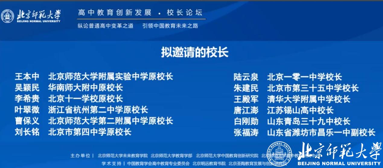 为了推动高中教育事业发展,经北京师范大学高中教育研究中心提议,由北京师范大学未来教育学院、北京师范大学教育学部、北京师范大学中国教育创新研究院、北京师范大学高中教育研究中心联合策划启动“高中教育创新发展·校长论坛”,并得到中国教育学会高中教育专业委员会、北京明远教育书院、北京圣陶教育发展与创新研究院提供的学术支持。