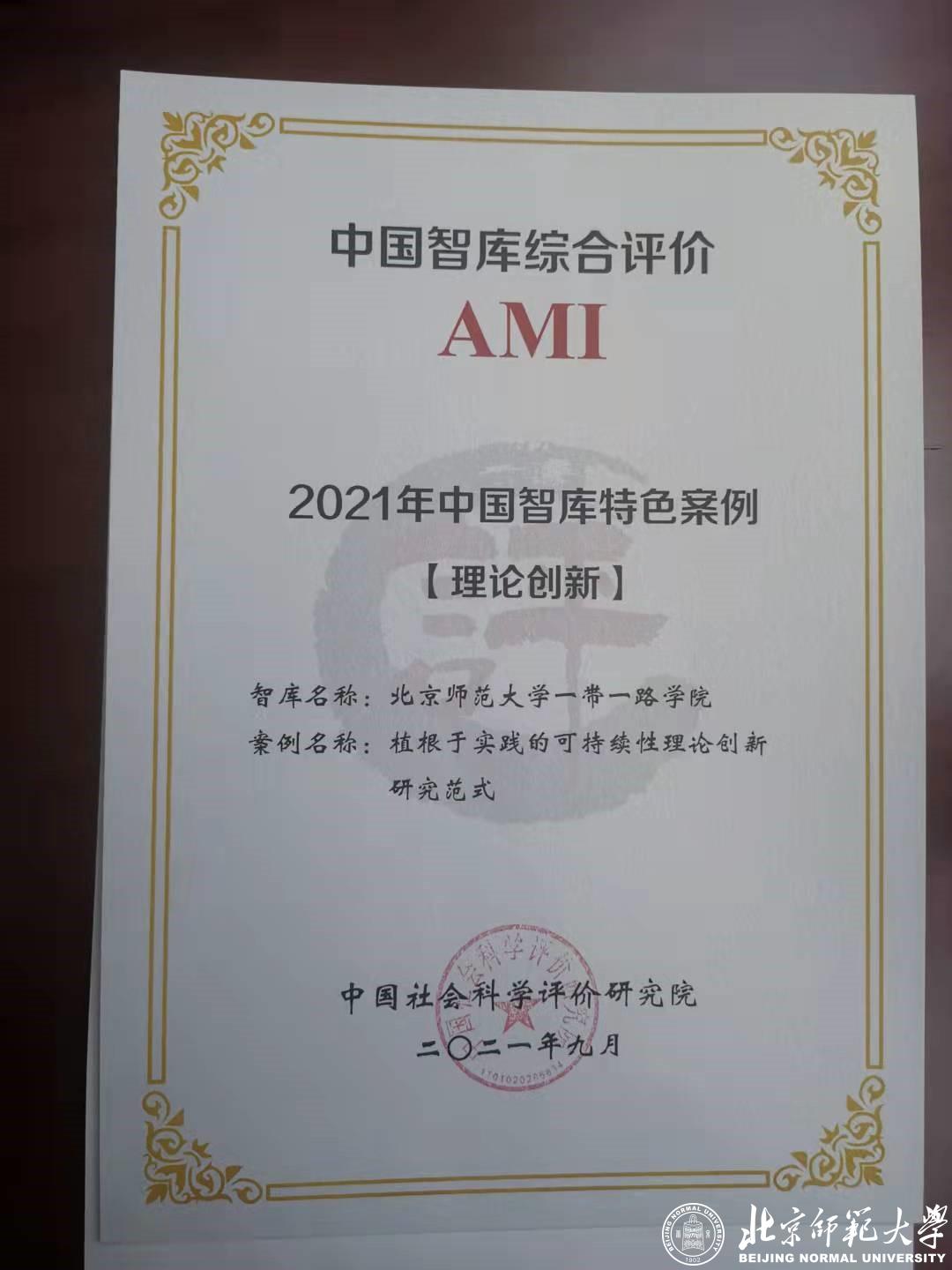 中国社会科学评价研究院在论坛上发布了《中国智库综合评价AMI 研究报告(2021)》,北京师范大学一带一路学院的案例“根植于实践的可持续性理论创新研究范式”获“2021年中国智库特色案例理论创新”奖,万喆研究员作为一带一路学院获奖代表出席论坛并领奖。