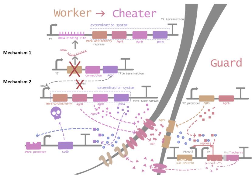 今年,BNU-China项目Cheat Me If You Can着眼于解决工业生产中基因改造后的菌株发生基因突变,从而无法正常合成目的蛋白的问题。为了解决这一问题,2021 BNU-China从自然菌群的模型中找到了灵感,开发出了通用的蛋白生产工业平台。在这个平台中,名为Guard的菌株可以特异性杀死发生了基因突变的Cheater菌株,以维持正常工作的Worker菌株的稳定。该平台不仅能够降低由于突变菌株出现导致的产品质量和数量上的巨大损失,还在菌种筛选、定向进化、生物医疗等方向具有广泛的应用前景。