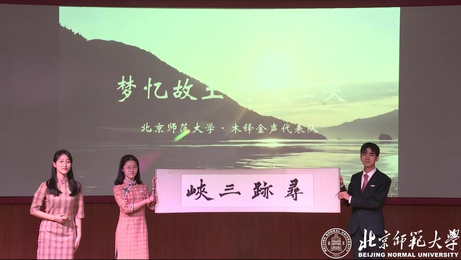 决赛以线上、线下相结合的方式举行,由各校参赛队与主会场视频连线进行现场表演。北师大代表队表演的原创作品《梦忆故土 寻迹三峡》以三位参赛选手与位于长江三峡的家乡的故事为主线,分为“屈原故里,望月思乡”“川军后代,去国怀乡”和“三峡移民,教育援乡”三个部分,分别串联了“古代——传统文化”“近现代——国族认同”和“当代——乡村教育”三个主题,契合参赛要求的同时,又充分展现了北京师范大学“教师教育排头兵”的特色,抒发了新时代两岸暨港澳青年勇担历史使命、传承木铎金声、弘扬中华文化、助力民族复兴的远大抱负。评委专家高度评价北师大代表队的表现,肯定了作品立意深刻高远,有民族志和社会学的价值,是决赛中最具创意的作品。最终,北京师范大学代表队荣获二等奖,并获得“十佳人气奖”。