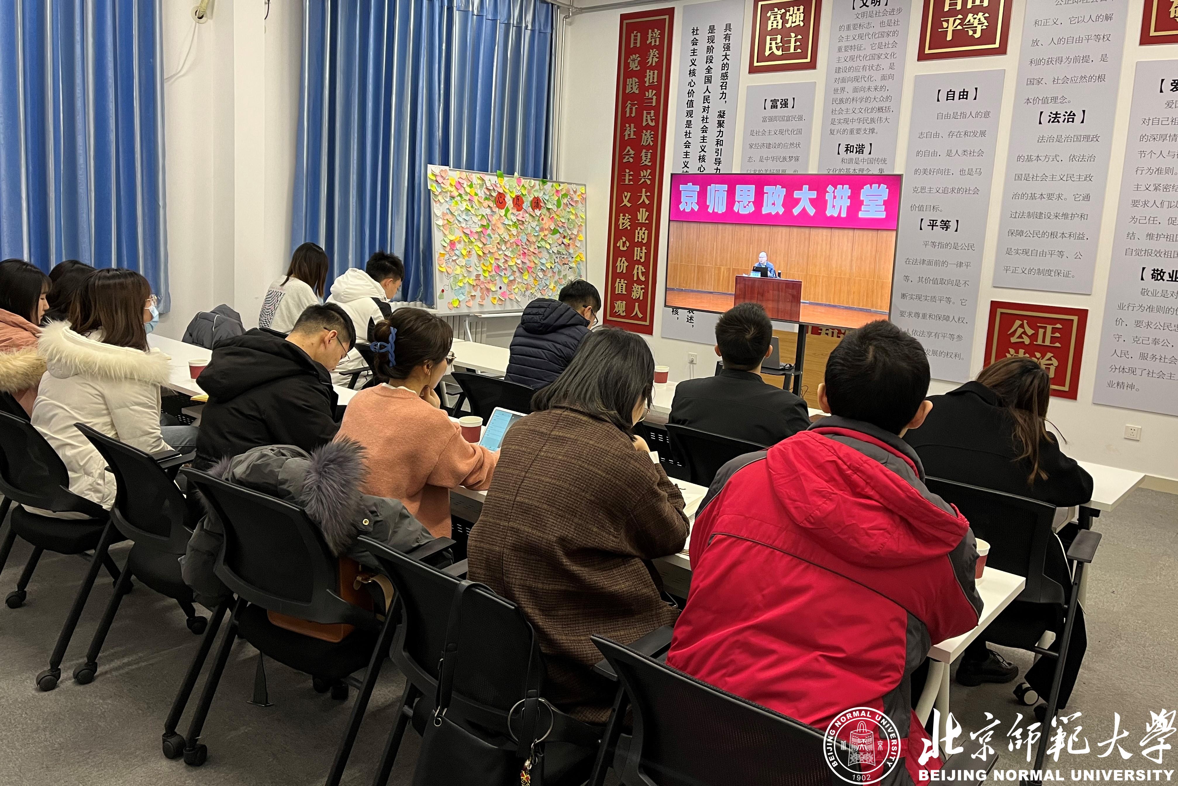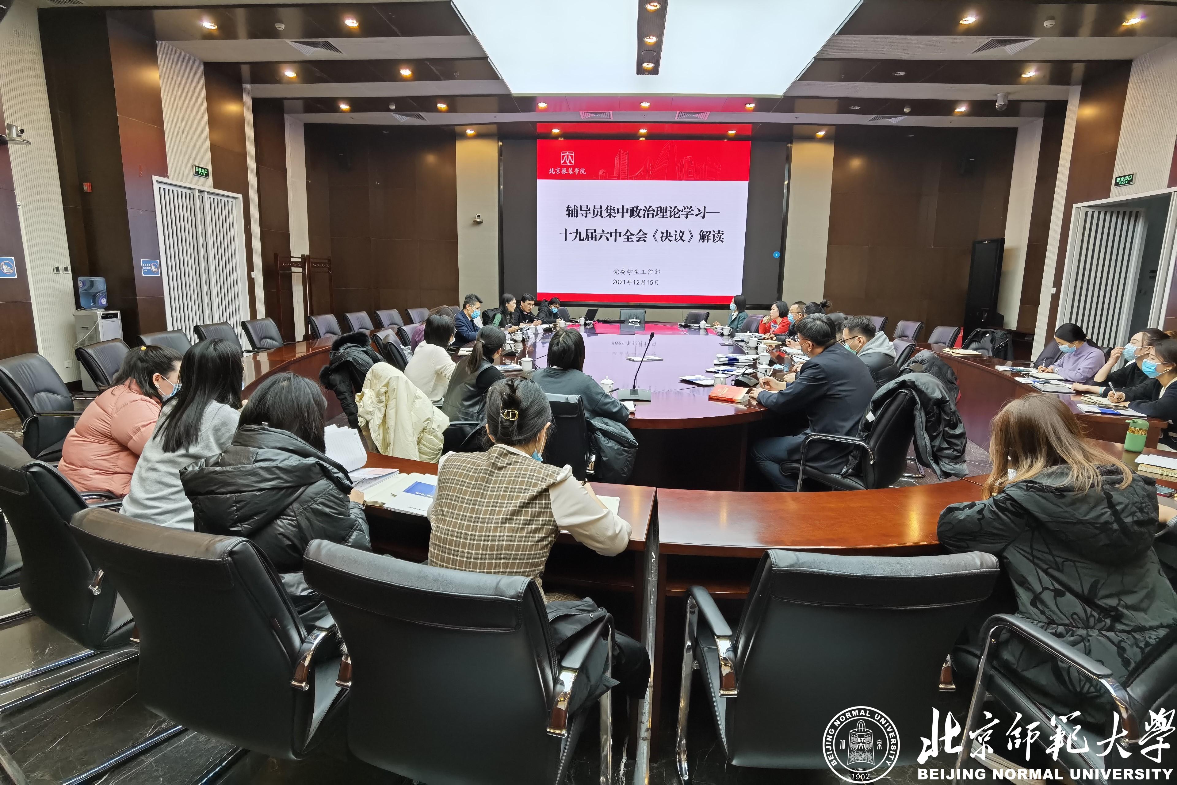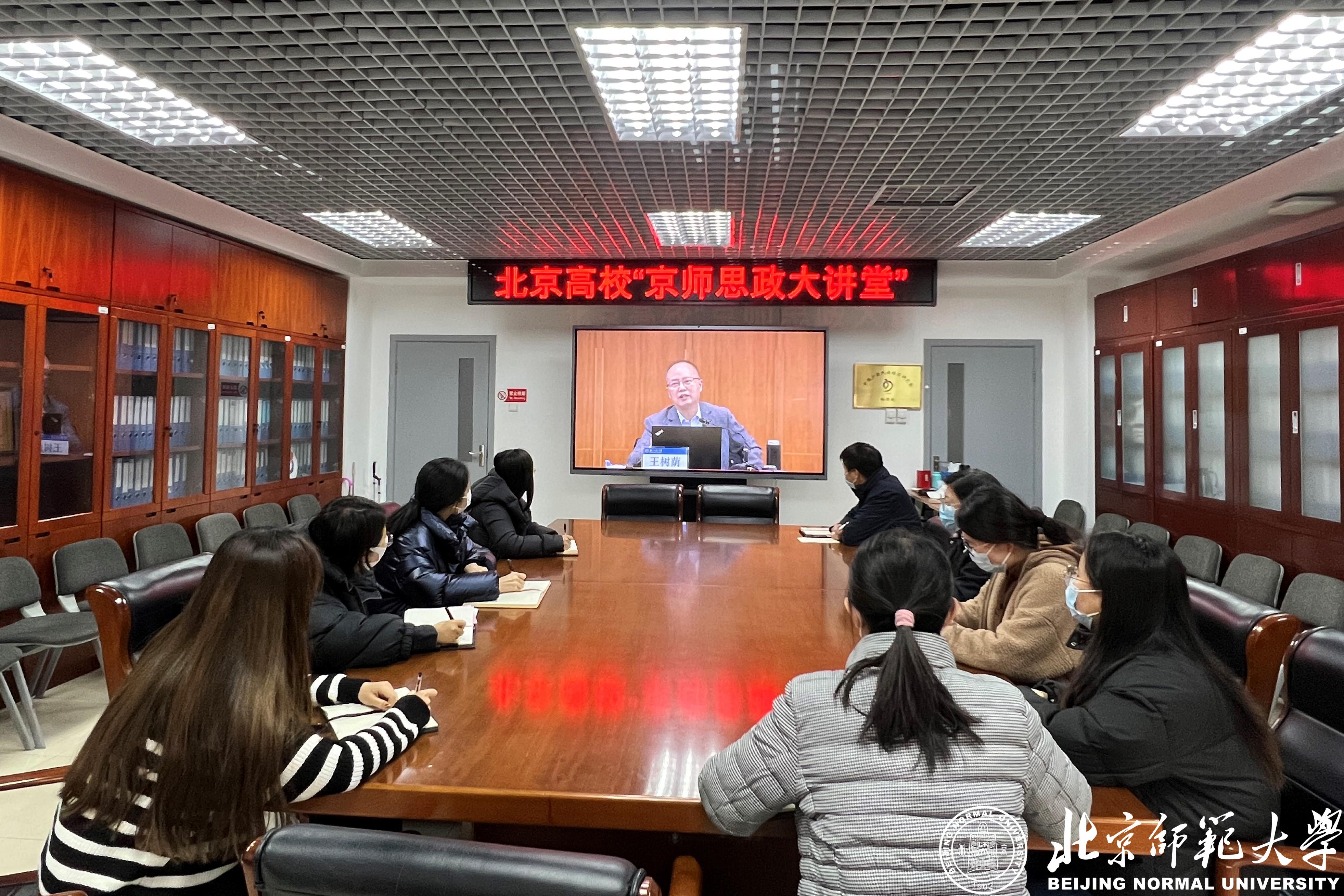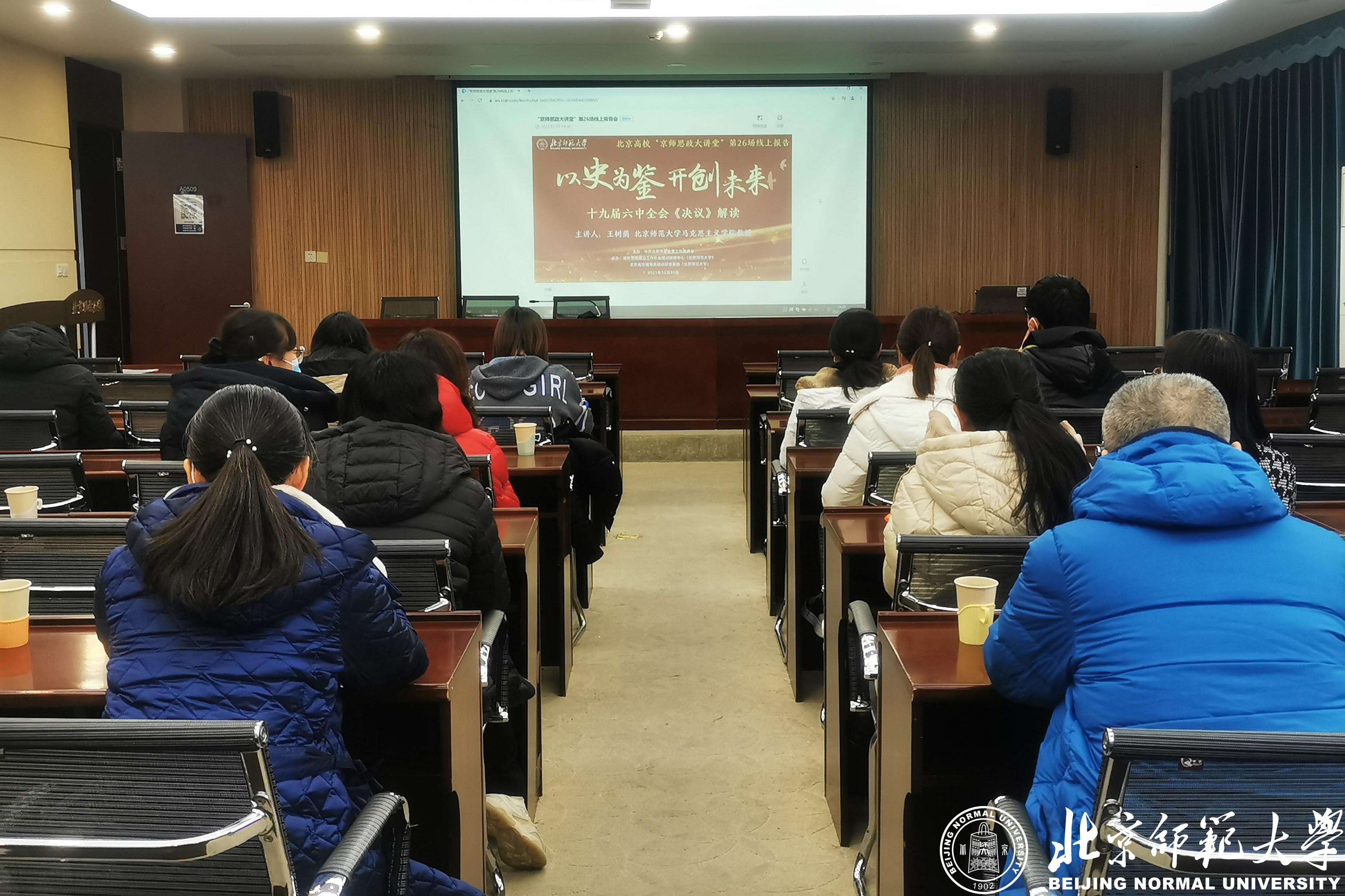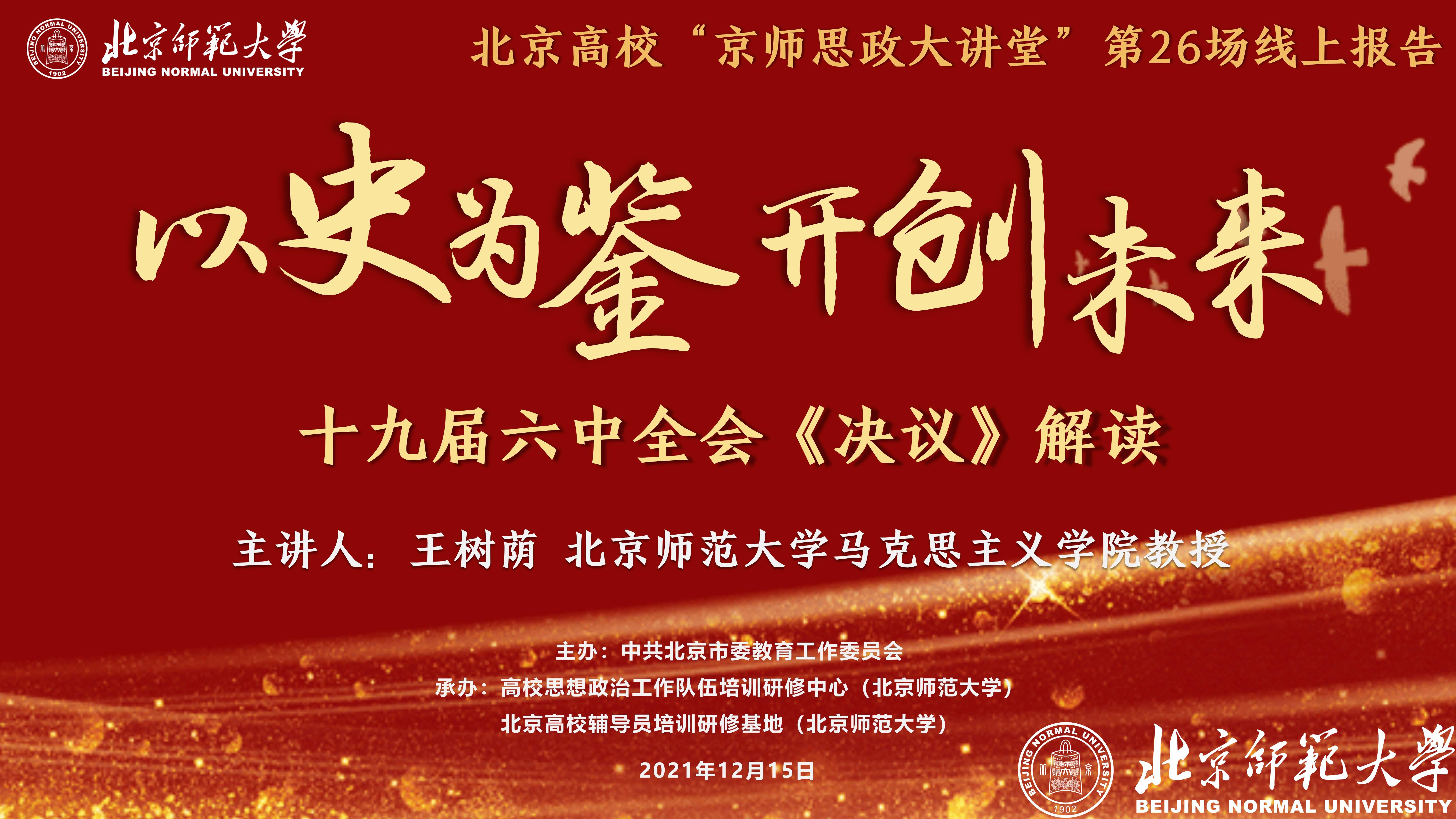 12月15日,由市委教育工委主办,北京高校辅导员培训研修基地(北京师范大学)承办的第26场北京高校“京师思政大讲堂”举行。北京师范大学马克思主义学院王树荫教授受邀作题为“以史为鉴,开创未来——十九届六中全会《决议》解读”的专题讲座,来自北京50余所高校的2600余名辅导员参加线上集体学习。
