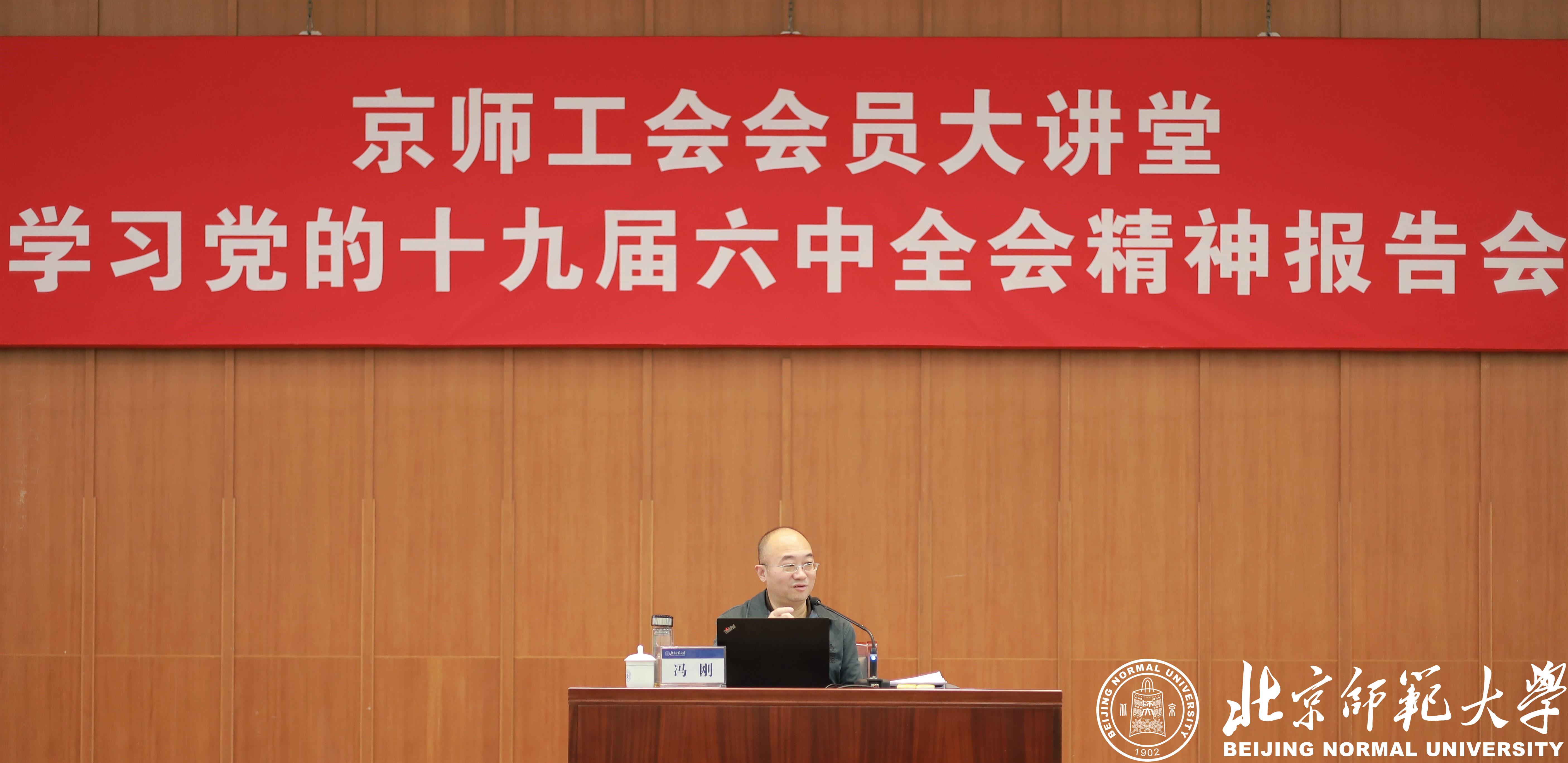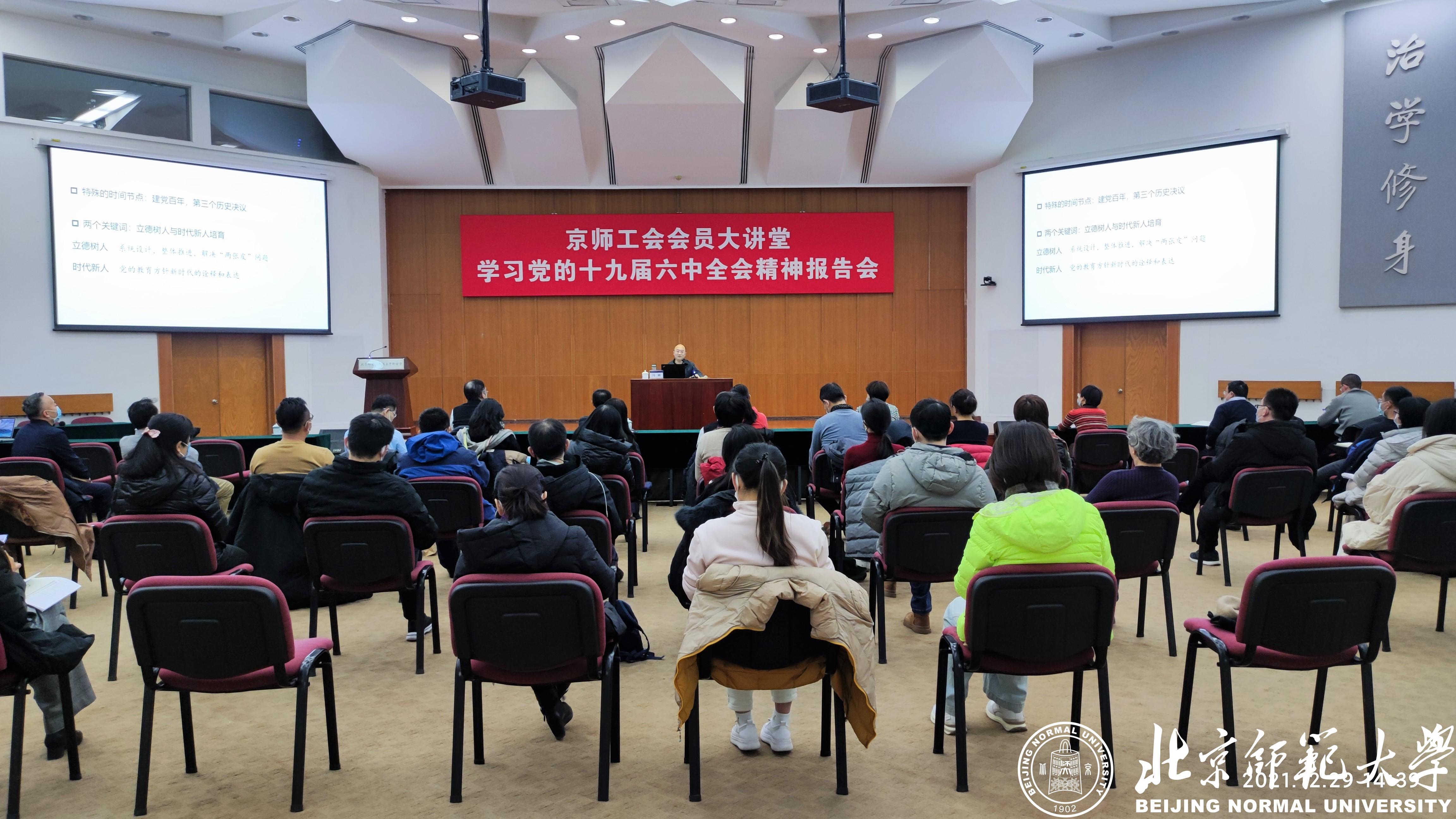 为深入学习贯彻党的十九届六中全会精神,不断推进新时代高校工会工作,进一步落实学校工作部署,提升北师大教代会工会干部、工会会员的思想政治素质,12月29日下午,校工会在英东学术会堂举办京师工会会员大讲堂“学习党的十九届六中全会精神报告会”,邀请教育部思想政治工作司原司长、学校思想政治工作研究院院长冯刚教授作“以百年党史引领新时代思想政治工作高质量发展”的专题辅导报告。学校教代会执委、各专门委员会委员、教代会代表,校院两级工会专兼职干部、教工社团协会负责人、工会会员等90余人参加报告会。报告会由校工会常务副主席王显芳主持。