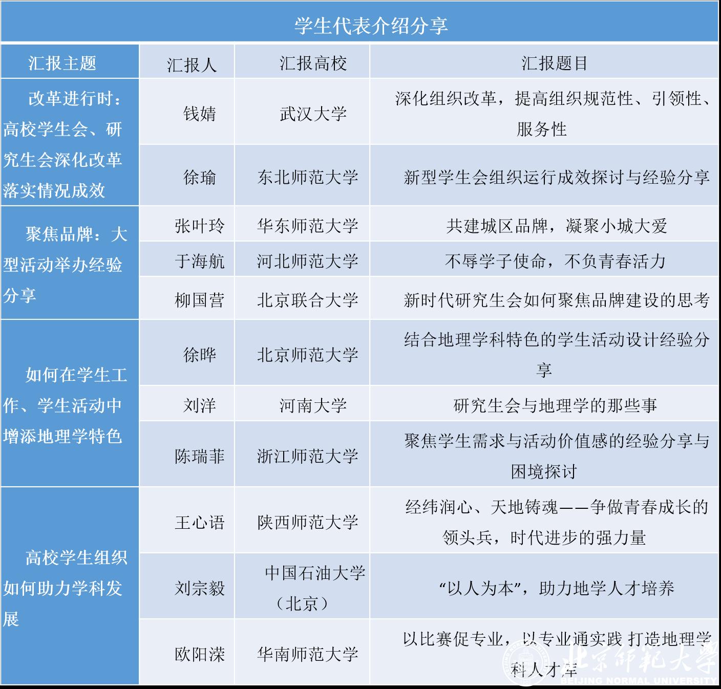 十一所高校研会、学生会学生干部依次进行汇报交流。各高校学生代表立足各学校特色和工作重点,分别就学生组织深化改革落实成效、大型活动经验分享、学生活动如何凸显地理学特色、学生活动如何助力学科发展等四个汇报主题展开了充分地交流与讨论。