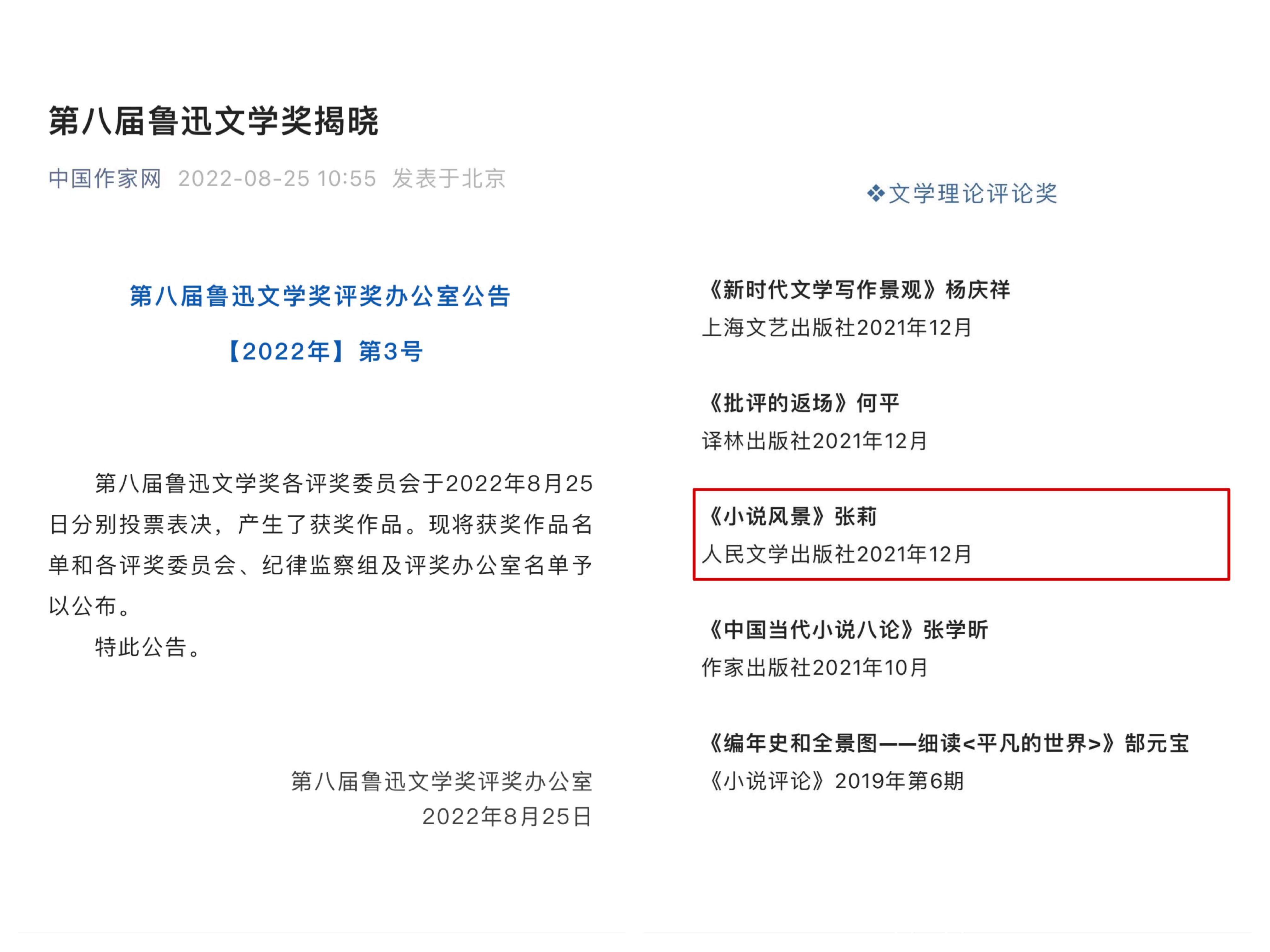 2022年8月25日, 第八届鲁迅文学奖揭晓,文学院张莉教授的论著《小说风景》荣获文学理论评论奖。