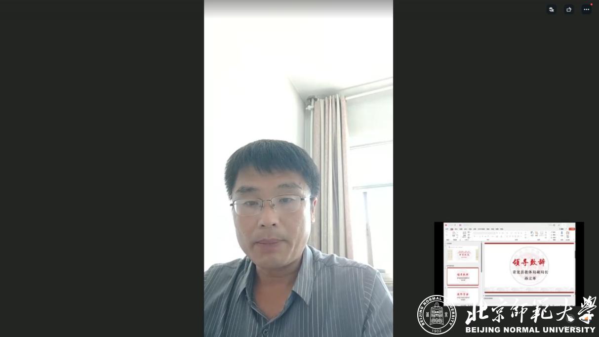 邱化民老师表示“铎声悠扬,奇冀一夏”北京师范大学线上夏令营的开设,本着自愿参与的原则,是高质量素质教育建设的一种尝试,寄托了对青龙县学子们教育追求的美好祝愿,也是师大学子书写教育理想的实践,更是双方在教育理念和实践上的一次共同成长。他提出了三点期望:一是期待参与线上夏令营的青龙县学子们不负鸿鹄志,鲲鹏万里程。在两周的时间里发掘自己的理想志趣,树立远大志向;二是期待本次暑期实践的北京师范大学教育学部同学们铸魂行不辍,润心期未来。担负青年使命,发挥自身教育学科优势,做“四有”好老师。三是期待北京师范大学与河北青龙县见证更多有意义、有情怀的教育合作的落地与开展。