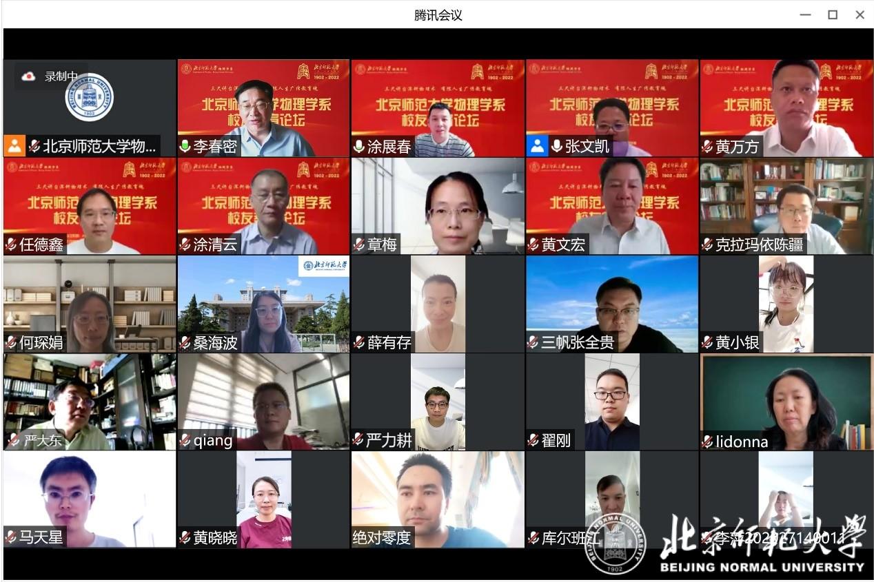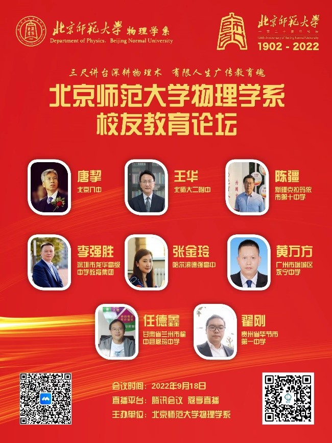 值此北京师范大学百廿校庆之际,物理学系为弘扬“学为人师、行为世范”的校训精神,于9月18日举办了“三尺讲台深耕物理术,有限人生广传教育魂”校友教育论坛,特别邀请多位优秀一线物理教育工作者分享个人成长经历和感悟,借以促进北京师范大学物理学系在物理教育和教师教育领域的长足发展。论坛在腾讯会议和蔻享平台同步进行,获得了校友及社会各界的广泛关注和一致好评。