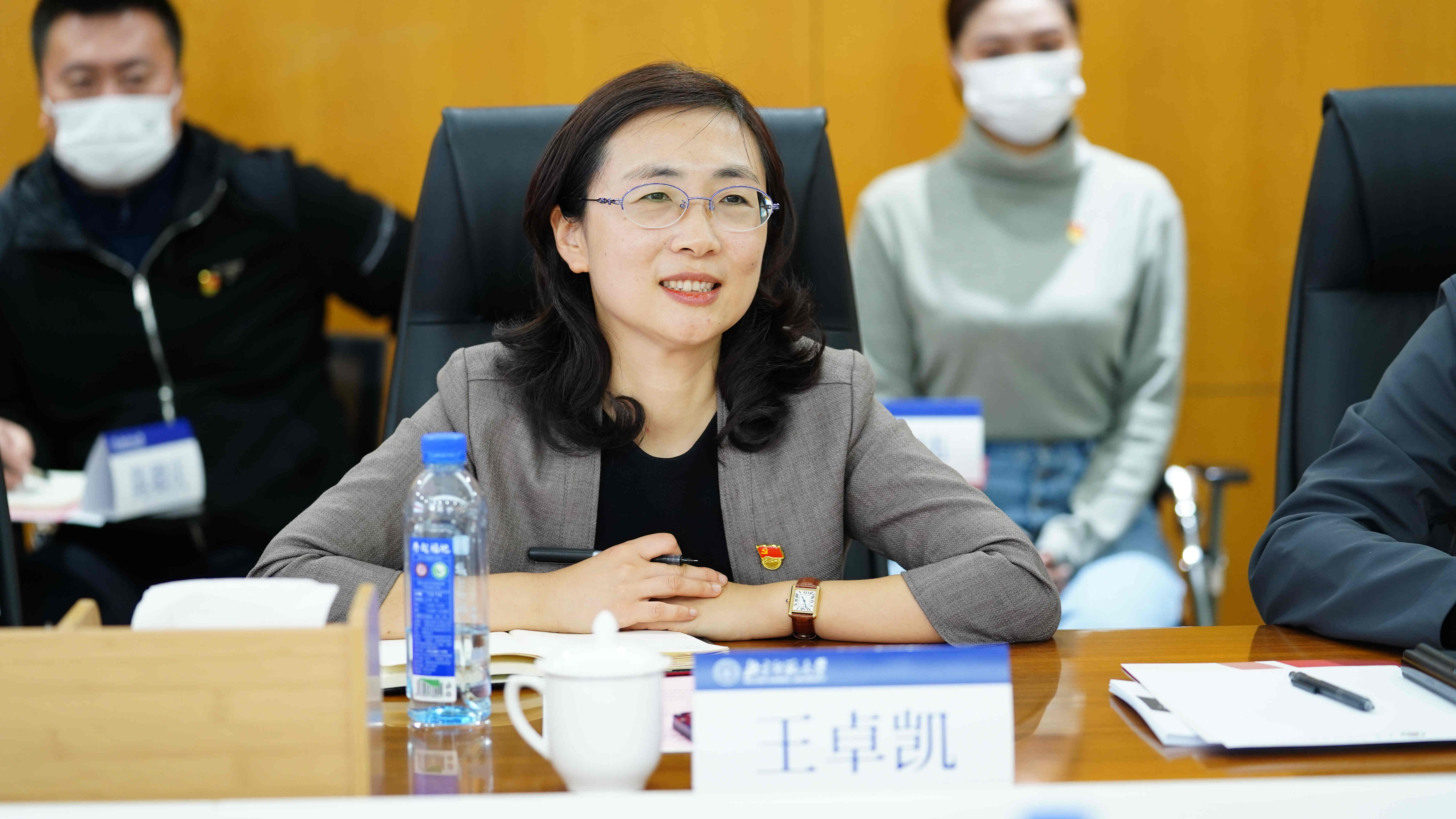 王卓凯从“党建工作”“人事工作”“学生工作”三方面进行汇报。她表示,学院党委始终坚持政治方向、发挥学科特色、落实“立德树人”根本任务,不断完善制度建设与保障,切实增强政治“领导力”、思想“引领力”、组织“执行力”和理想“信念力”。王卓凯强调,学院师生始终在学校和学院党委领导下积极发展、自觉投身实践。今后,学院将继续深入学习贯彻总书记重要回信精神,注重团队建设、落实全程培养、聚焦长效引领,为培育更多具有高度社会责任感和使命感、具备高水平艺术教育素质的师生而努力,以实际行动迎接党的二十大胜利召开。