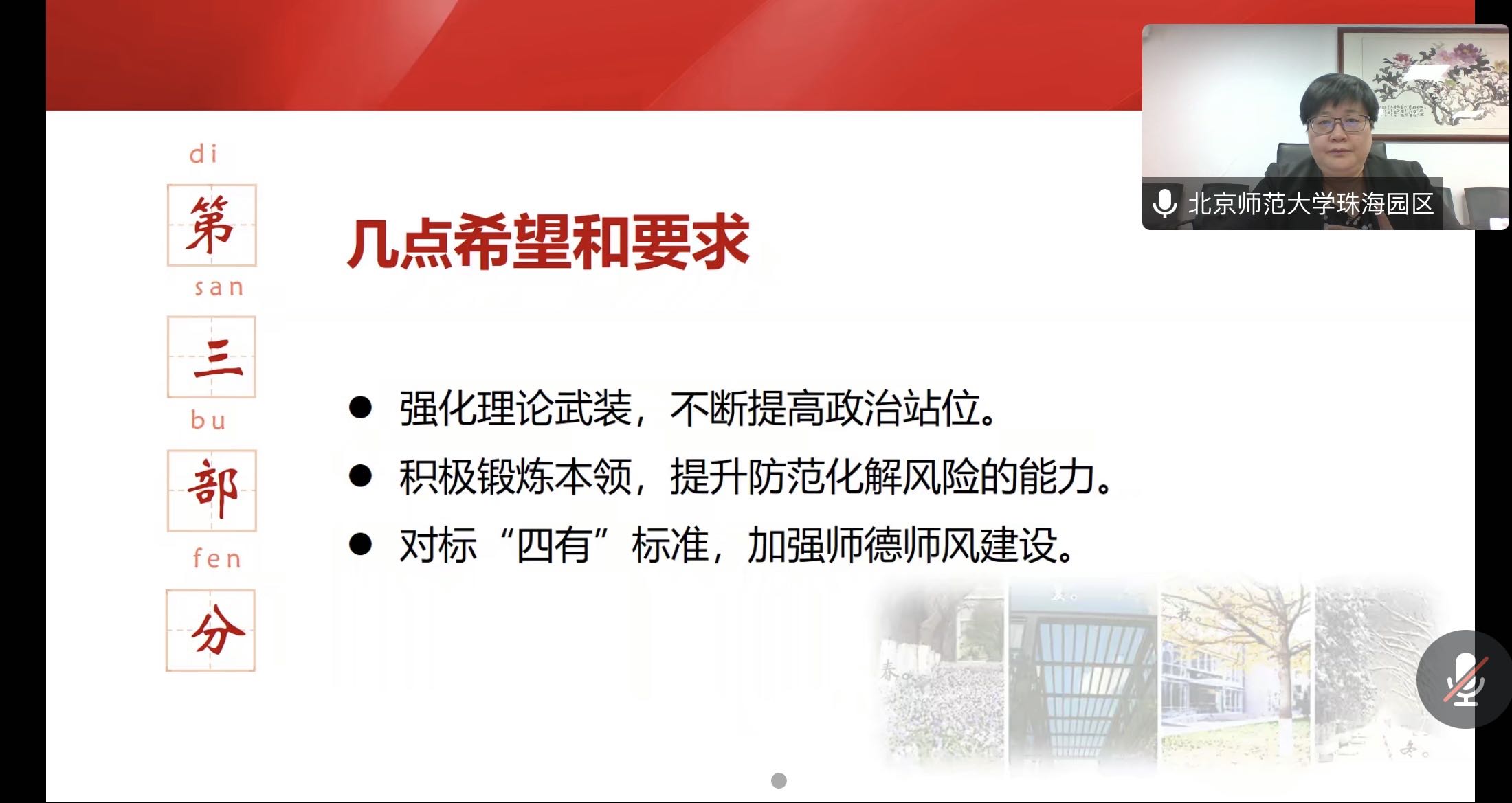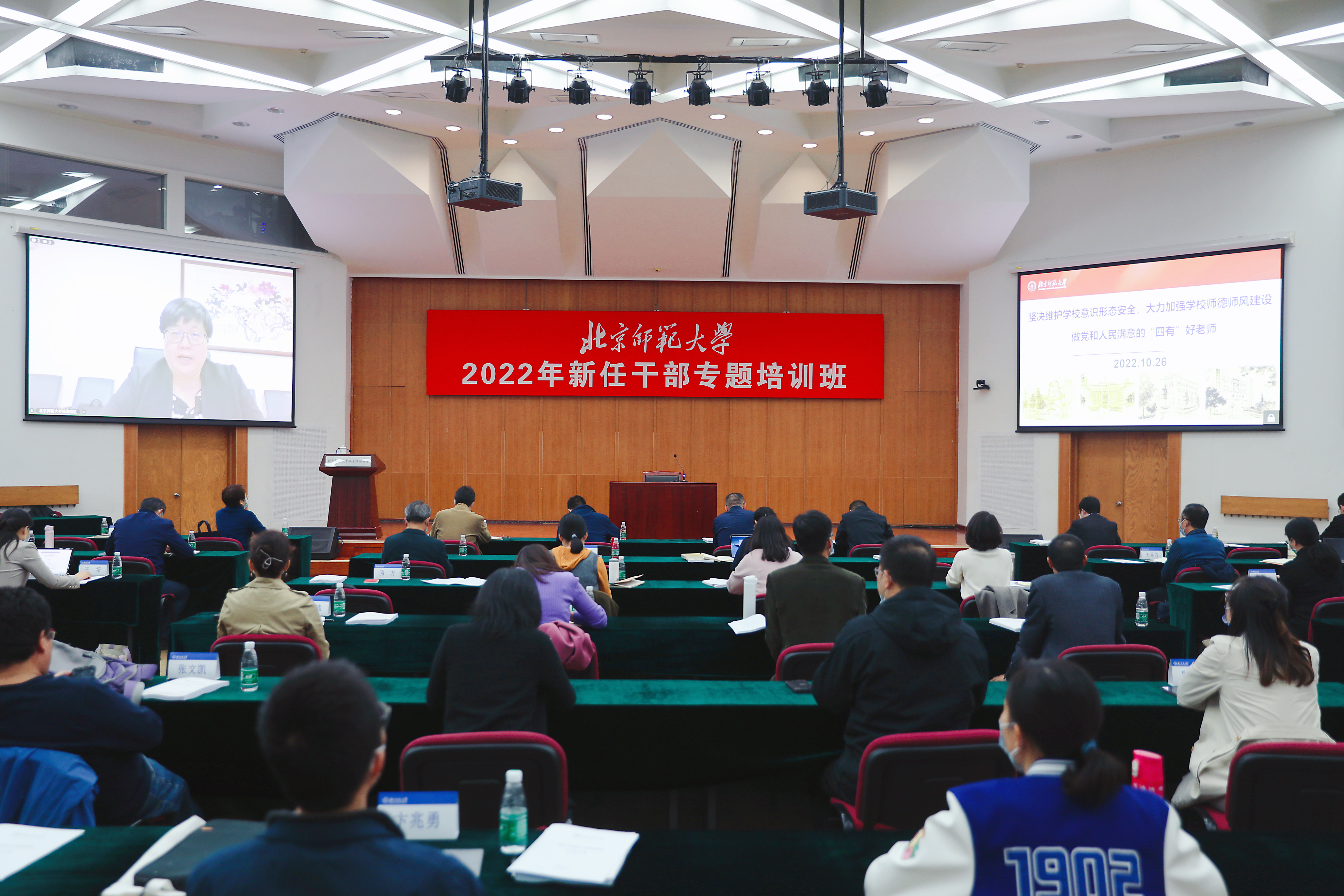 10月26日下午,校党委副书记韦蔚通过视频形式为2022年新任干部作了题为《坚决维护学校意识形态安全 大力加强学校师德师风建设 做党和人民满意的“四有”好老师》的专题报告。