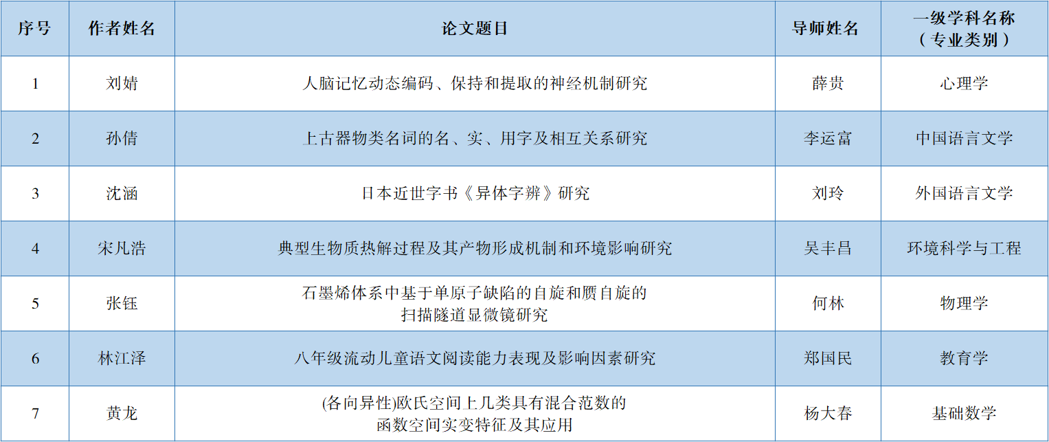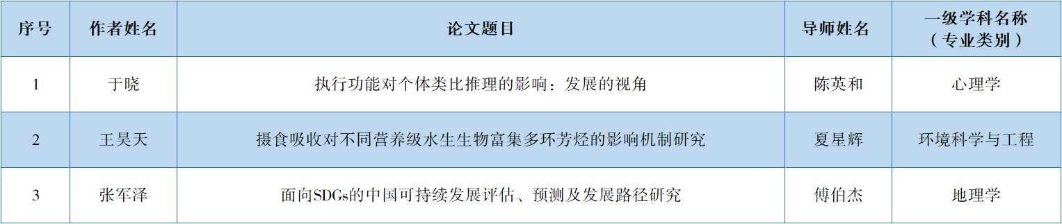 北师大共有3名教师被评为北京市优秀研究生指导教师,1个团队被评为北京市优秀研究生指导教师团队,7篇论文获北京市优秀博士学位论文,3篇论文获北京市优秀博士学位论文提名。