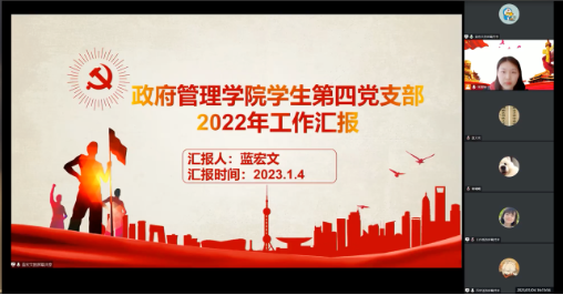 2023年1月4日下午,政府管理学院2022年度党建工作交流大会暨党支部书记述职会于线上召开。本次大会旨在总结党支部建设情况,交流党建工作经验,进一步加强和改进基层党支部建设,促交流,强党建,共发展。大会由张碧婉同志主持,与会嘉宾有北京师范大学党委组织员孙留萍,政府管理学院党委书记于海波,政府管理学院院长、党委委员章文光,政府管理学院党委副书记张冉冉,政府管理学院党委宣传委员王磊,政府管理学院党委青年委员果佳,政府管理学院党委纪检委员黄崑,政府管理学院党建组织员谢羚。政府管理学院教工一支部、教工二支部全体教工党员和5个学生党支部全体学生党员参与本次大会。