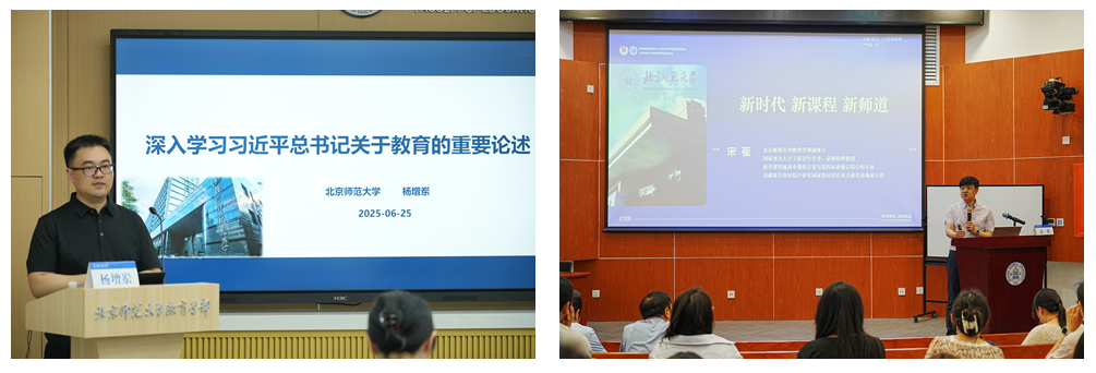 活动中,发展规划部发展与政策研究室主任、马克思主义学院副院长杨增岽作《深入学习习近平总书记关于教育的重要论述》专题讲座,他系统阐释了新时代教育工作的根本任务和方向指引,强调“优师计划”师范生要牢记立德树人根本使命,将个人成长融入教育强国建设。教育学部副部长、教师教育研究所所长宋萑作《新时代 新课程 新师道》专题讲座,结合最新教育政策和实践案例,深入剖析了基础教育课程改革背景下未来教师的核心素养与专业发展路径。