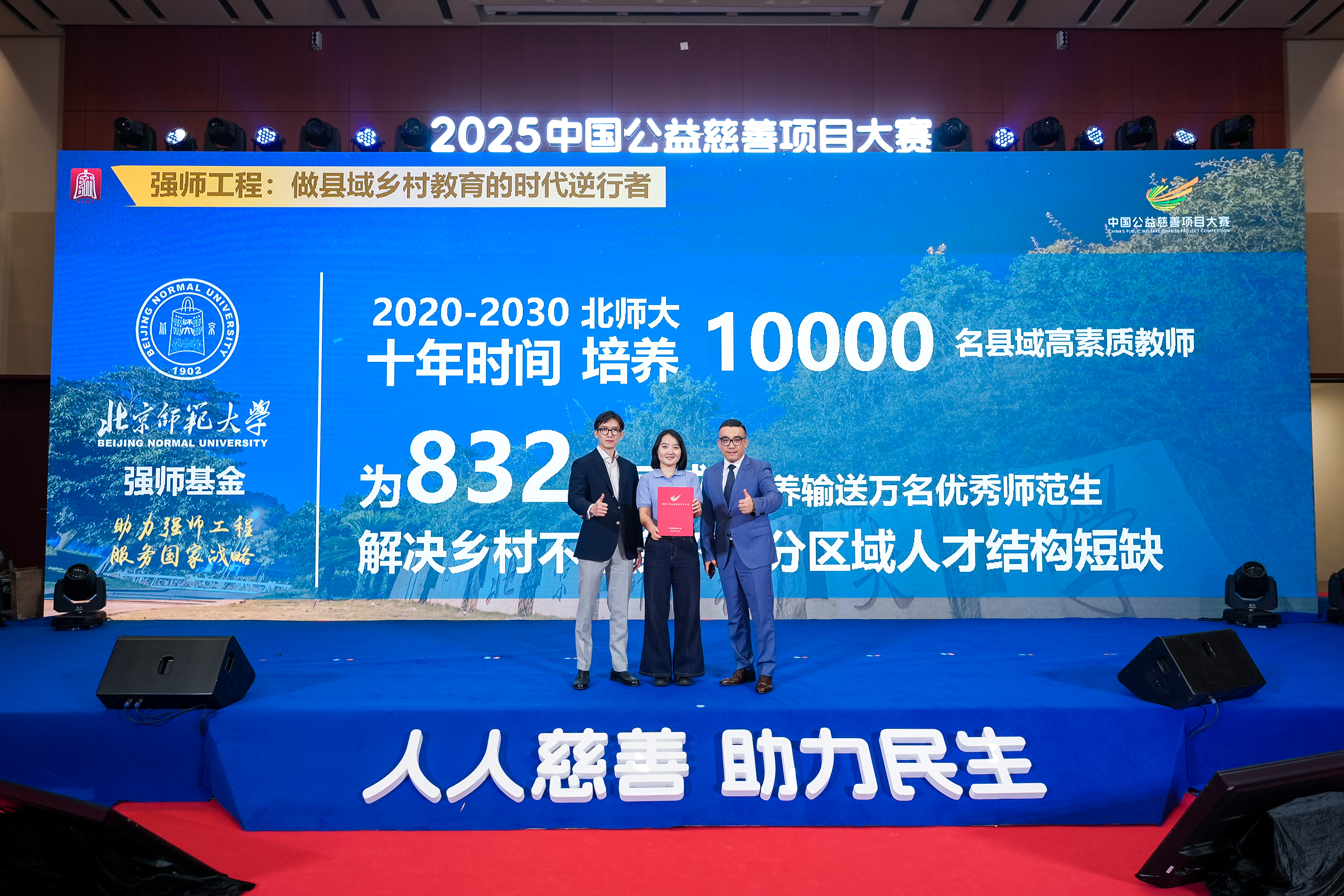 12月11日,2025中国公益慈善项目大赛决赛在广州白云国际会议中心举行。北师大教育基金会“强师基金助力县域教育振兴项目”(申报名称“强师工程”)从300余个项目中脱颖而出,最终以总分第二名的成绩荣获2025中国公益慈善项目大赛一等奖,并获得一类资助项目10万元资金支持。