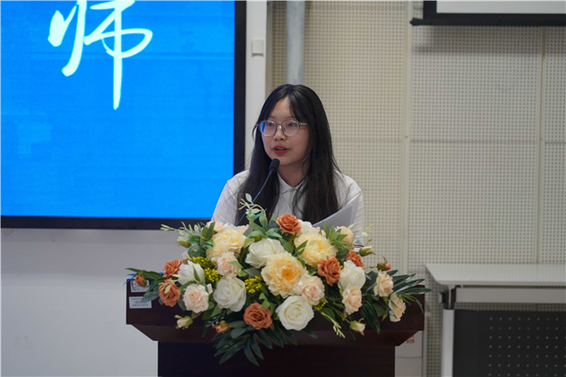 2023级地理科学专业(优师计划)本科生谭云秋雪发言。她表示,在教育实践中深刻体会到了区域间教育资源的差异,更加坚定了毕业后到祖国和人民最需要的地方去的决心。同时,她鼓励今年参加暑期教育实践的同学们以饱满的热情投身实践,在实践中淬炼成长,让青春之花绽放在祖国最需要的地方。