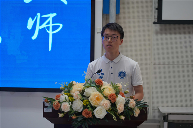 2022级数学与应用数学专业(优师计划)本科生王保森发言。他分享了去年在教育实践中的感悟和思考,表示在备课授课、社会调研中真切感受到了教育的温度和重量。他祝愿所有即将踏上新征程的实践队同学行有所获,以热忱浇灌三尺讲台,用脚步丈量祖国大地。