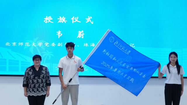 韦蔚向暑期教育实践队队长代表授2025年暑期教育实践队旗。
