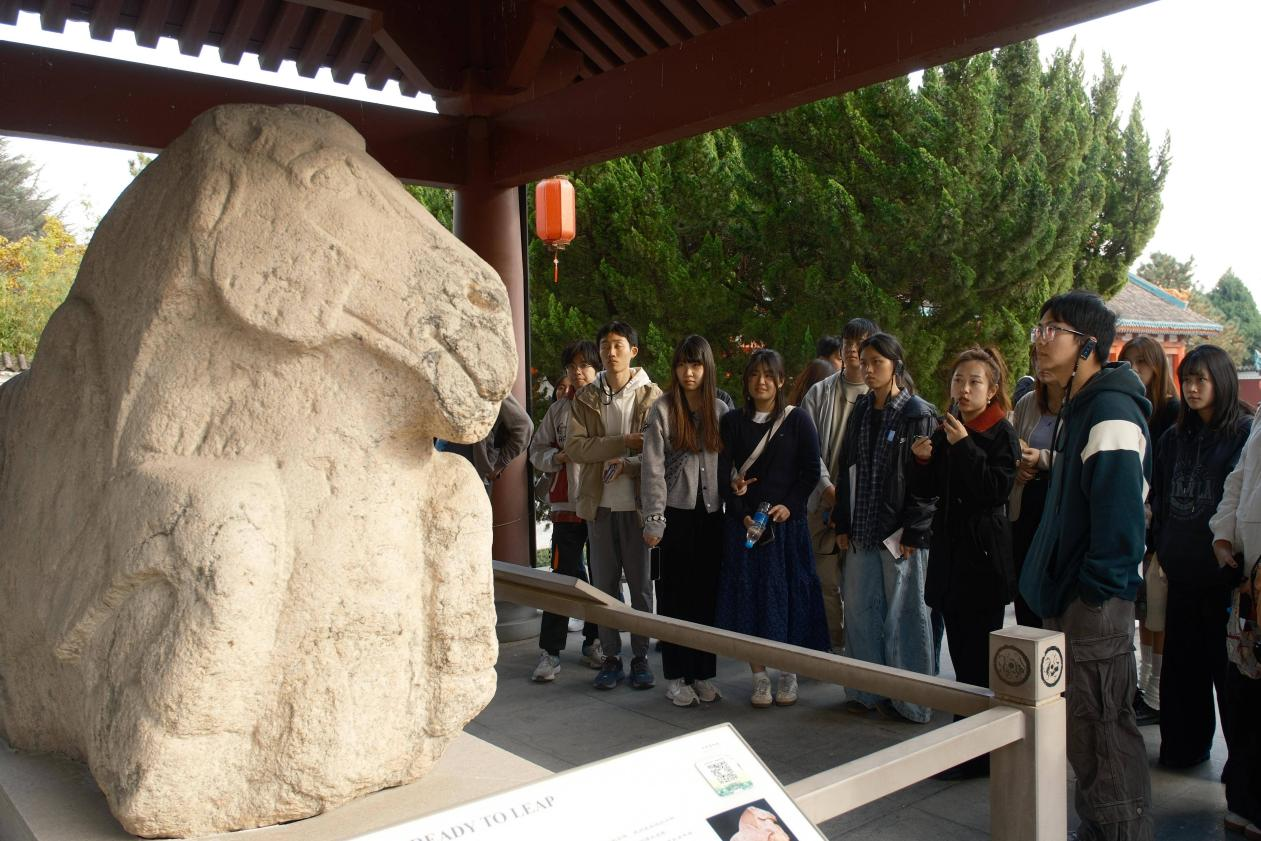 10月31日,团队前往宝鸡、咸阳,走进周原博物馆、法门寺、乾陵等地开展现场教学。召陈西周建筑基址前,同学们且行且思,为三千年前先民的建筑工艺与智慧深深折服,在遥想“周原膴膴,堇荼如饴”的繁盛景象时,探讨周的起源、共和行政、昭穆制度等历史问题。法门寺地宫的精美锡杖、乾陵神道的六十一蕃臣像、章怀太子墓“吴带当风”的使臣壁画,一件件文物、一幅幅画作,让不同文化的交流与融合直观地展现在同学们面前。地理科学学部澳门学生欧阳咏琪表示:“此次实地考察让我对华夏文明有了更真切的触摸,身为澳门青年,我愈发明白自己肩负着传承中华文明的责任。”