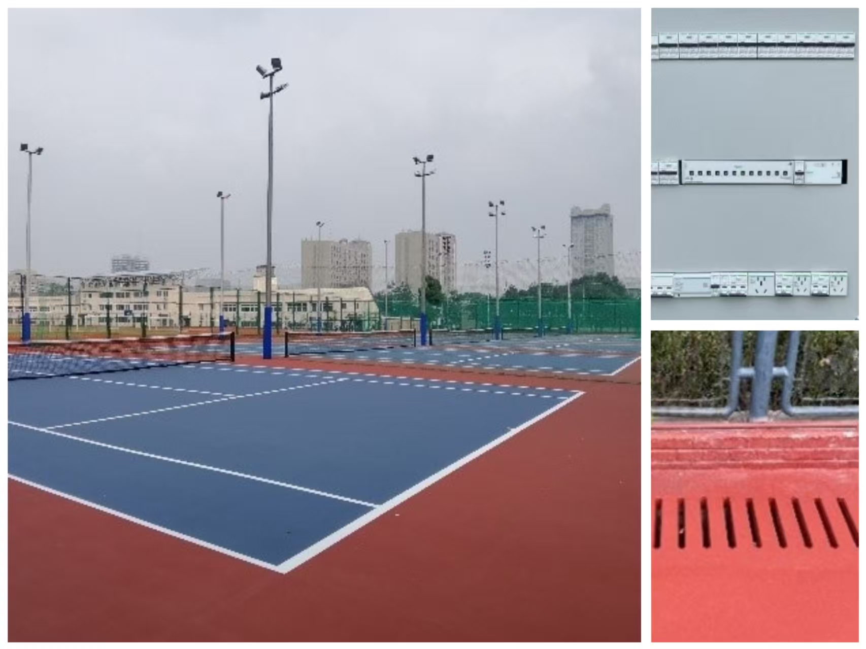 随着使用年限增长,我校网球场老化的问题不断加重,地面涂层开裂脱落,虽经多次局部修补,但修补后的面层光滑度较高,容易导致人员滑倒摔伤;场地排水不畅,积水无法快速排出;照明线缆使用多年,绝缘层老化,存在安全隐患。同时,由于照明预埋电缆采用串行连接方式,无法分场地控制开关,不能根据实际使用需求灵活调控光源。
