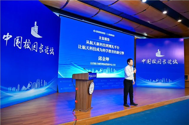 文昌航天城管理局投促中心主任邱金坤,结合自身跨界发展经验,以《从航天新科技到观礼平台,让航天科技成为科学教育的新引擎》为题作报告,通过介绍文昌发射场的独特优势、对比国际航天旅游教育模式、分享在地实践成果,层层递进地阐明了航天科普教育的重要性与发展潜力,为科技特色教育的推广提供了创新视角。
