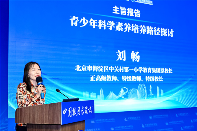 北京市海淀区中关村第一小学教育集团原校长、教育部基础教育道德与法治教学指导专业委员会副主任委员刘畅,以《青少年科学素养培养路径探讨》为题作报告。她阐释了青少年科学素养的涵义、维度及对个体、社会、国家的重要性,分享了国内外科学教育成功经验,提出了青少年科学素养培养需校、家、社、政府合力克服挑战的路径方法。她强调,科学素养与人文素养需协同发展、有机统一,并倡导引导学生像科学家一样思考、像工程师一样创造。