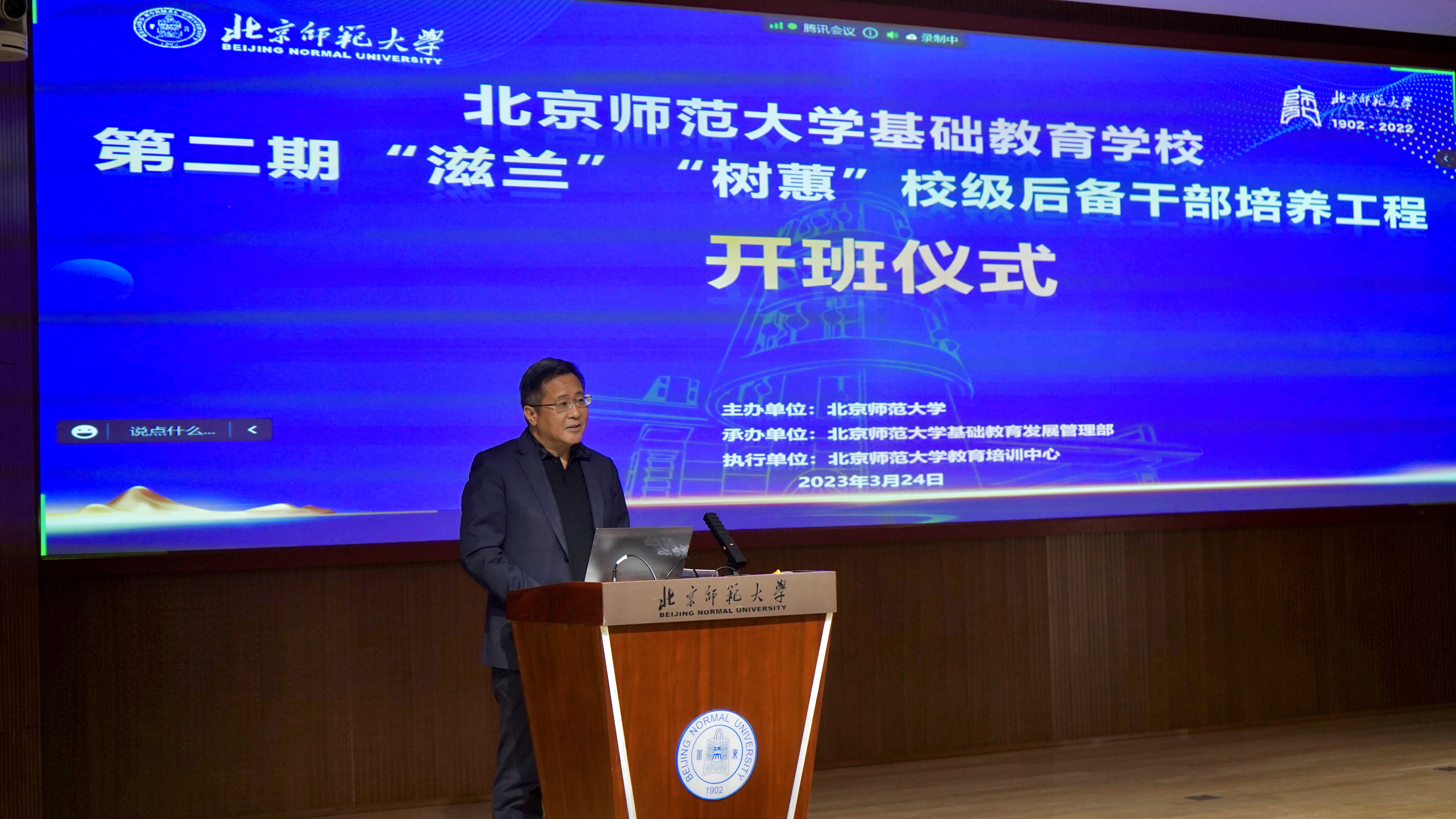 为加强北京师范大学基础教育学校校级干部队伍建设,增强基础教育学校“内部造血”功能,提升学校治理体系和治理能力现代化水平,3月24日,北京师范大学基础教育学校第二期“滋兰”“树蕙”校级后备干部培养工程开班仪式在北京师范大学举行。北京师范大学副校长王守军出席开班仪式并致辞。基础教育发展管理部相关负责同志出席开班仪式。