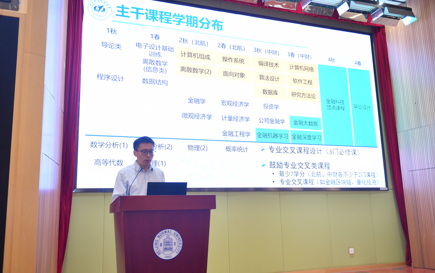 在建设经验分享环节,4所开展跨校联合学士学位项目先行先试的高校代表先后作了精彩报告。北京航空航天大学计算机学院副院长、教授杨海龙分享了北航-中财“计算机科学与技术+金融科技”项目;北京邮电大学人工智能学院副教授袁彩霞介绍了北邮-外经贸“人工智能+金融科技”项目;中央财经大学财政税务学院教授寇恩惠分享了中财-北理“税收学+人工智能”项目;北京师范大学心理学部副部长、教授骆方介绍了北师-北航“心理学+人工智能”项目。