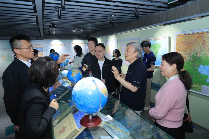 在沉浸式观展过程中,四场主题升华教学与陈列空间深度耦合,构建起“行走的思政课堂”。汪前进在“山川历历”展区开讲“溯舆图绘制之源 探华夏古今之变”,以历史脉络回溯中国古代的制图智慧。王静爱在学部历史长廊前,以减灾防灾系列图集为依托,讲述“传百廿学脉之光 绘家国经纬之卷”。王俊友在“山高水长”展区,结合多元的地图展品,讲述“筑疆域法理之基 护地图规范之纲”。朱良在地图收藏的展柜前,以《写地图人生之诗 述人地和谐之情》为题,如数家珍地讲述了各国出版的珍贵地图集及其价值,其中朱良与国外专家以“地图领带”结缘的故事也彰显了地图作为一门“通用语言”的独特价值。