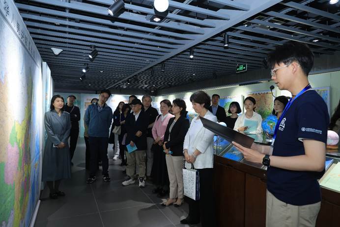 在地理科学学部2021级本科生梁名智的导览下,与会嘉宾共同参观展览。本次展览匠心打造“山河有界、山川历历、山海承续、山高水长”四大叙事空间,融科普性、学术性、艺术性于一体。“山河有界”展区以国家版图教育为核心,图文并茂生动诠释领土、领海、领空的主权内涵,强调了“规范用图无小事,一点一线皆山河”的国家版图意识。“山川历历”展区,从《甘肃舆图》山水绘画,到《盛京全图》的计里画方,呈现出多元的古代地图制法,方寸舆图中蕴含着古代疆域治理智慧。“山海承续”主题长廊以编年体形式铺陈北师大地理学科百年传承,从白眉初先生的《中华建设新图》奠基南海疆域线、邹代钧奠定中国近代地图学里程碑,到黄国璋在地理学教育、地理科研、地理学会的开创性贡献,再到北师大教授史培军团队贡献世界、国家、区域多尺度防灾减灾系列图集,彰显着代代学人“把论文写在祖国大地上”的学术担当。尾声“山高水长”展区通过水晶地图、立体地图、卫星影像地图、地球仪等多元呈现形式,让参展者通过视觉、触觉体验与地图产生交互,深度走进地图、沉浸享受地图。