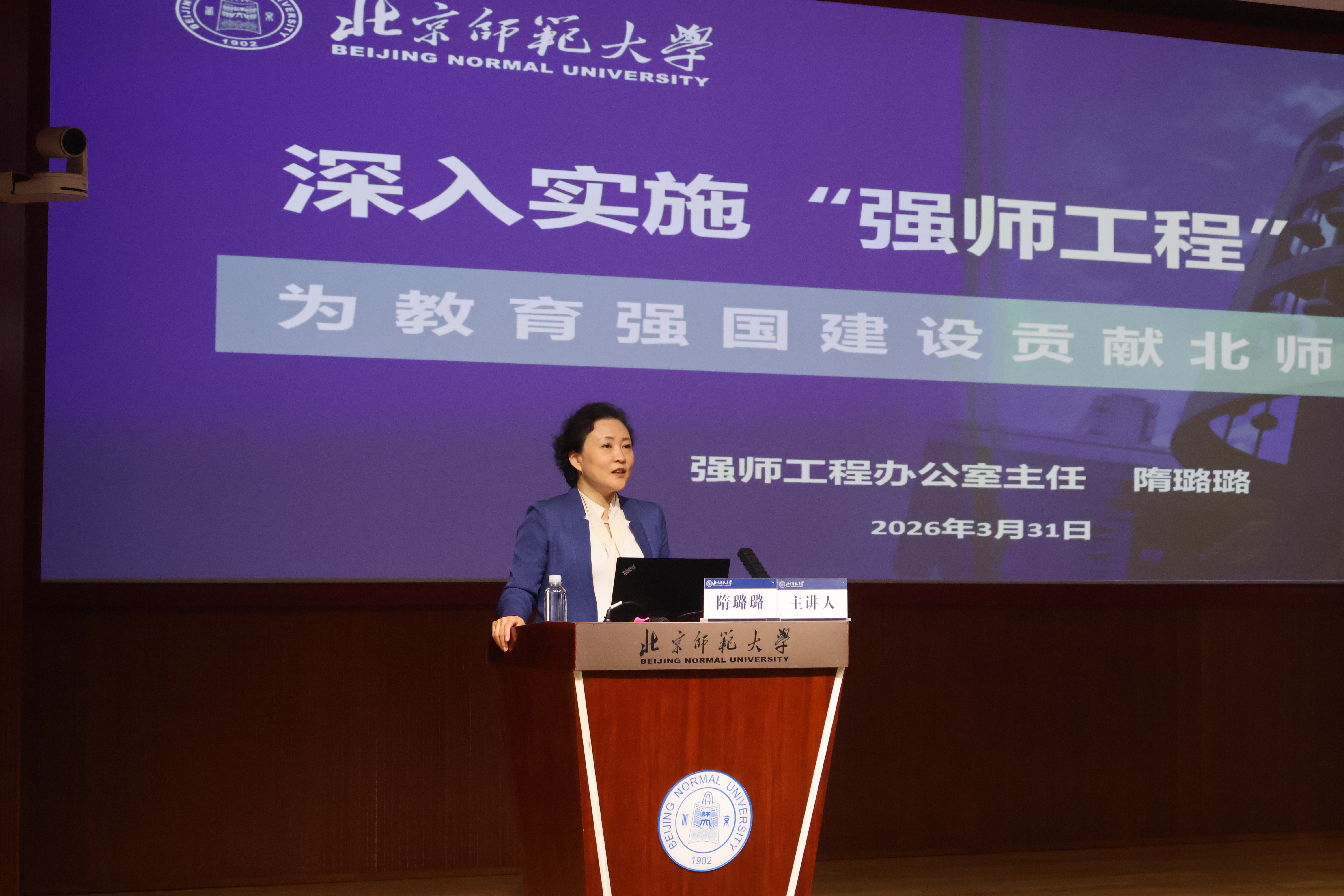 隋璐璐从提出背景、举措成效、社会影响、未来展望四个方面对学校实施“强师工程”作了详细的解读和阐释。她指出,“强师工程”旨在培养造就高素质专业化创新型教师队伍。其核心思路是“培养一批、输送一批、提升一批”,通过“优师计划”“启航计划”“教师能力提升计划”“基础教育质量监测和诊断计划”“‘四有’好老师奖励计划”“教育部师范教育协同提质计划”,形成职前培养、精准输送、职后培训的全流程培养和支持体系,重点服务中西部欠发达地区基础教育发展,破解师资短缺和质量不均难题,为教育强国建设提供强有力的队伍支撑。未来,强师工程还将聚焦构建多学科支撑体系,贯通教师终身发展全周期,升级工作体系等方面,全面开创强师工程新局面。
