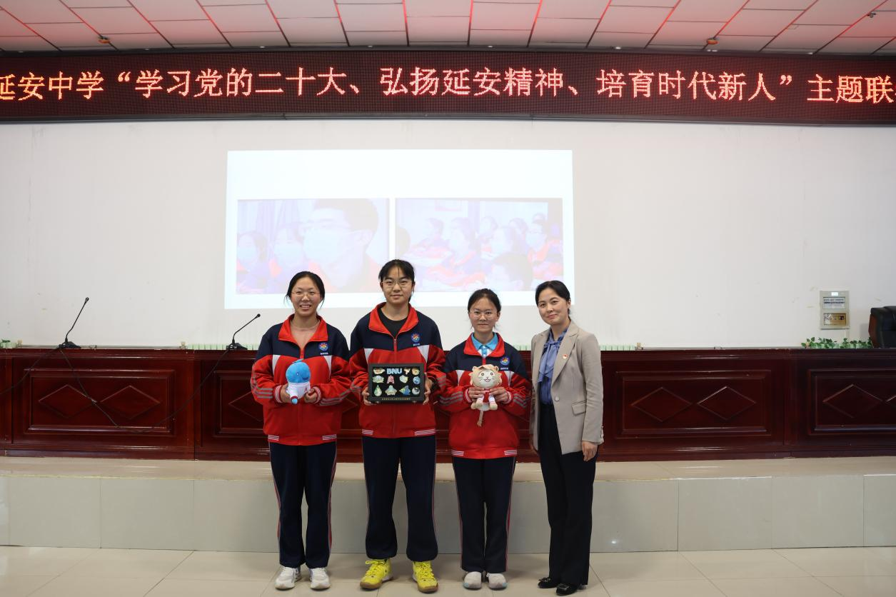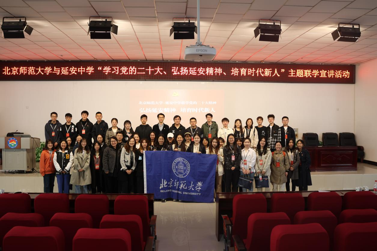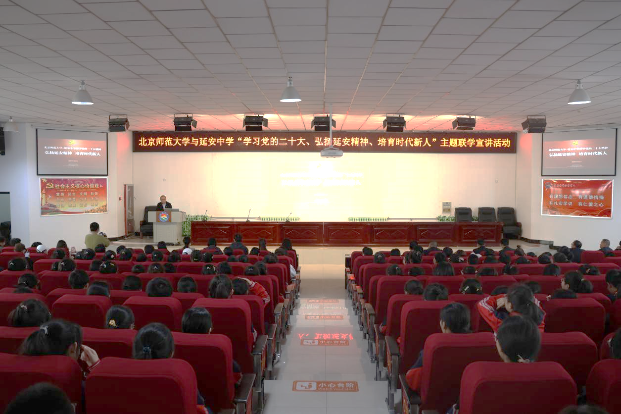 为深入学习贯彻习近平新时代中国特色社会主义思想和党的二十大精神,积极推动理论宣讲进中小学,进基层一线,以青年声音讲好宣传好党的奋斗历程和伟大成就,4月14日,北京师范大学学习贯彻党的二十大精神主题巡讲团走进延安中学,与延安中学师生共同开展“学习党的二十大,弘扬延安精神,争做时代新人”主题活动。延安中学党委书记、校长贺建旗、工会主席杨万青、副校长郭博、学校党总支书记、党支部书记、北师大党委学生工作部相关负责同志,以及来自北师大及延安中学的350余名师生参加活动。