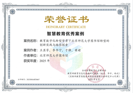 图书馆立足学校发展战略,积极开展一系列卓有成效的创新实践,逐步形成“基础设施支撑→核心业务赋能→用户服务升级→素养培训深化”的完整AI+图书馆应用体系,全面推动图书馆从传统服务向智慧服务转型。8月,图书馆“教育数字化转型背景下北京师范大学图书馆转型的创新实践与路径探索”案例,荣获本年度“全球智慧教育大会”智慧教育优秀案例。